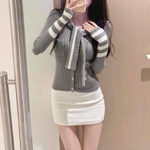 Vネックデザインとボウタイがアクセントとなり、シンプルながらも上品な印象を与えます。