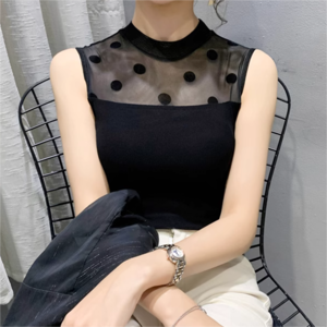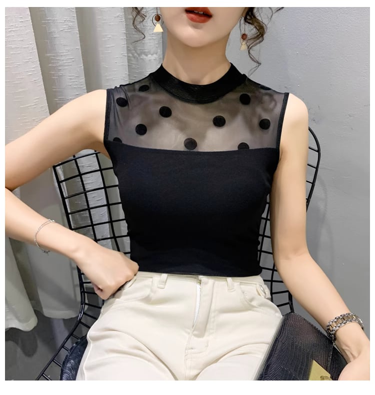 エレガントな印象を与えるタンクトップです!ドット柄のレースが施された高級感あるデザインが魅力で、ハイネックとノースリーブのシルエットが美しさを際立たせます。メッシュ素材が軽やかに肌を包み込み、伸縮性にも優れているため、快適な着心地を実現。デイリーユースはもちろん、特別なシーンでも活躍する一枚です。シンプルながらセクシーな雰囲気を醸し出し、自信を持って着こなせるアイテムです!