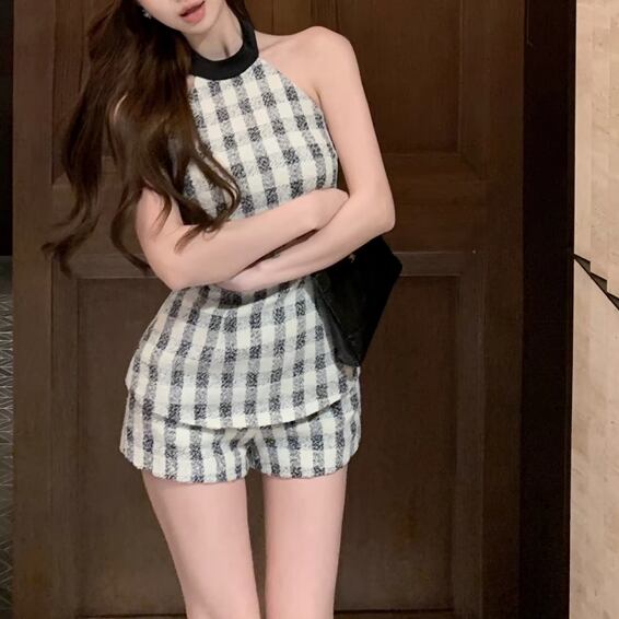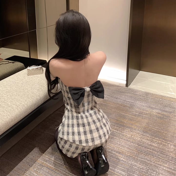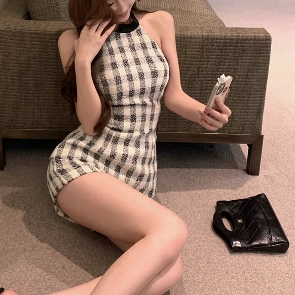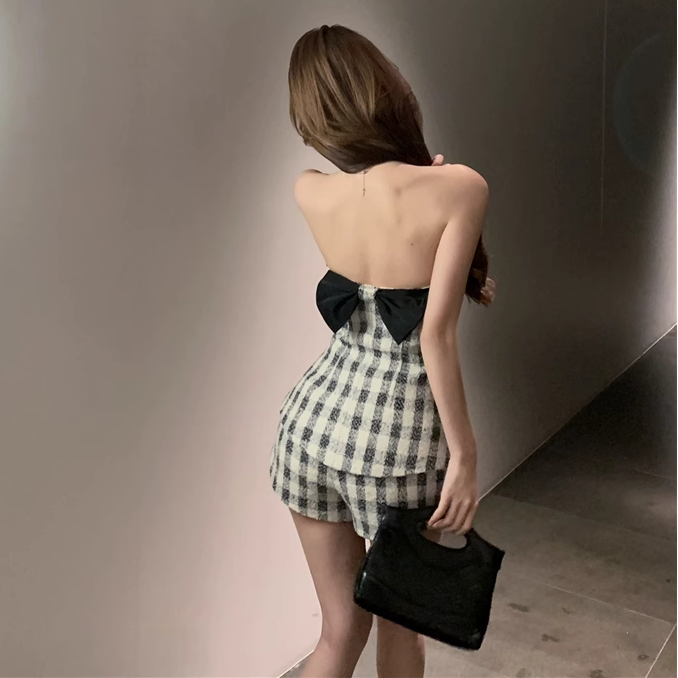 バックリボンがポイントのツイード映え♡バックリボンセットアップは、エレガントさとセクシーさを兼ね備えた魅力的なミニドレスです!斬新なホルターネックデザインとバックレスの仕様が、女性らしさを際立たせ、背中のラインを美しく演出します。暖かい季節にはピッタリなツイード素材とチェック柄で、セレブ風の洗練されたスタイルを楽しむことができます。特別な日のお出かけや、カジュアルなディナーにも最適な一着です!