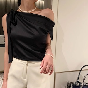 トレンドを先取りする♡アシンメトリーなデザインが魅力のリボントップスです。オフショルダーで肩を美しく見せ、リボンのディテールがアクセントとなり、華やかさを演出します!カジュアルにもエレガントにも合わせやすく、幅広いシーンで活躍すること間違いなしの一枚です。