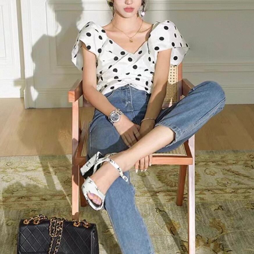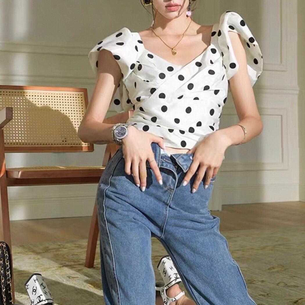 ボリューム袖 ドットブラウス が新登場♡ドット柄とパフスリーブデザインが大人の遊び心を感じさせるスタイル♡カシュクールスタイルが女性らしさを引き立て、甘すぎずモードな雰囲気を演出します。