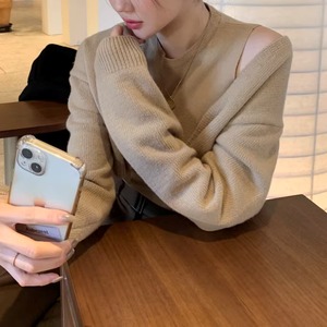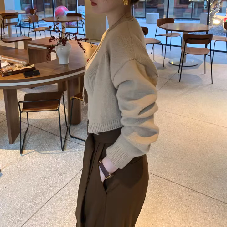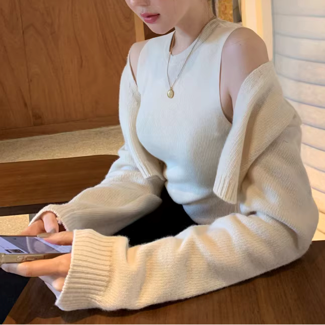 大人の女性にぴったり☆カーディガン+ノースリーブニット クロップドボレロ インナーセットのアメスリアンサンブルニットが新登場です!カーディガンとノースリーブのクロップニットボレロがセットで柔らかなニット素材で着心地も快適。上品なデザインは、カジュアルからエレガントなシーンまで、様々なスタイルにフィットします!