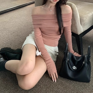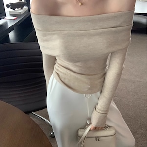 大人の女性におすすめ☆上品☆オフショルニットです!ハイゲージのリブニット素材を使用した、シンプルながらも洗練された雰囲気を醸し出すトップスです。オフショルダーのデザインが柔らかい印象を与え、ふんわりとしたタッチ感が魅力!無地でありながら、スリムフィットなシルエットが体型を美しく引き立ててくれます。