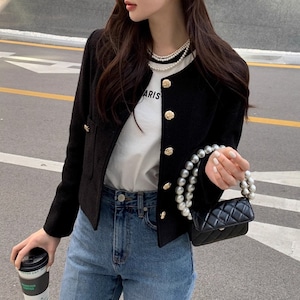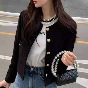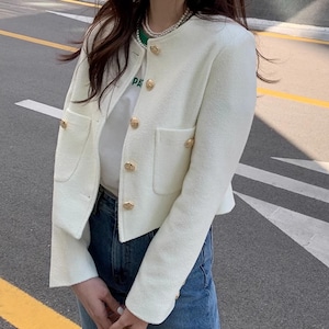 シックな雰囲気を醸し出す☆クラシックモダン ノーカラージャケットです!このアイテムは、シンプルなデザインの中にゴールドボタンが華やかさを添えたノーカラージャケットが特長で、カジュアルからフォーマルまで様々なシーンで活躍します。ミドル丈で、どんなコーディネートにも合わせやすく、エレガントなスタイルを楽しむことができます!大人の女性にぴったりの一品です。