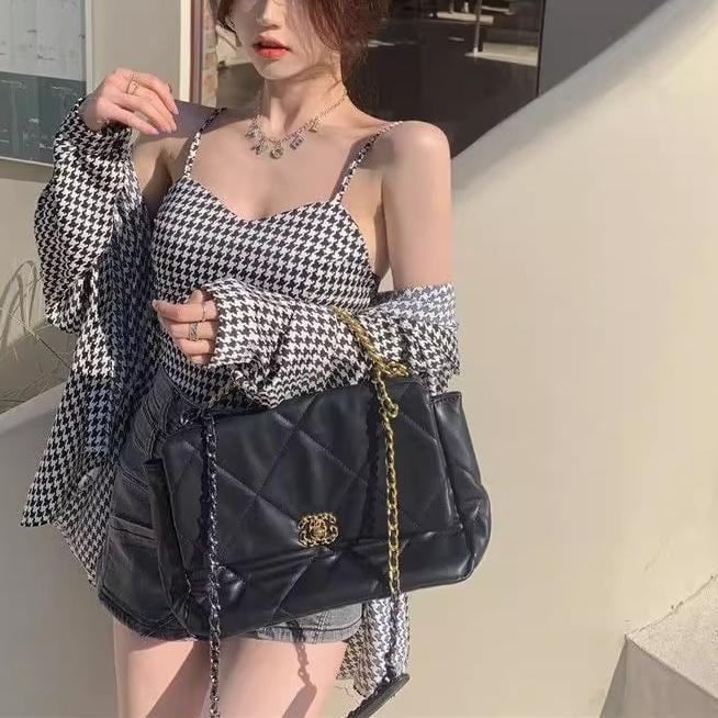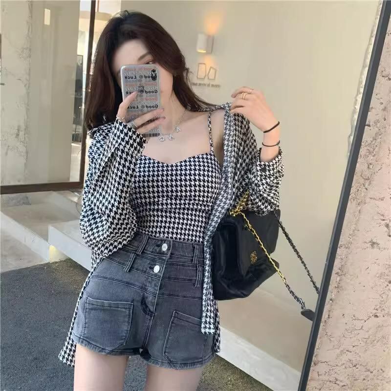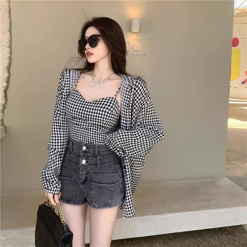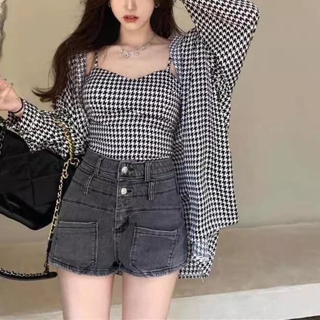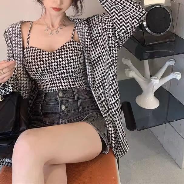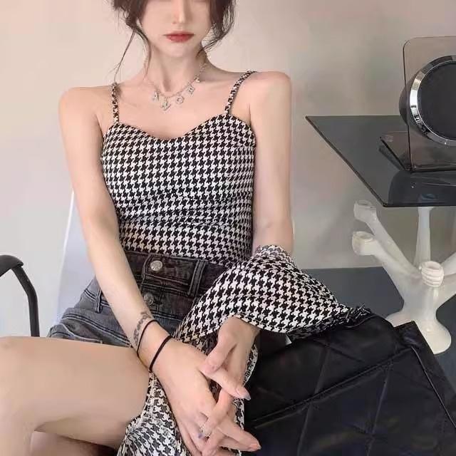 大人の女性におすすめ☆レトロ可愛い印象を与える!千鳥格子デザインの大人きれいめセットアップのご案内です!このセットアップは、キャミソールとパンツの組み合わせが特徴で、カジュアルながらも上品さを漂わせます。こなれ感と抜け感を演出し、普段使いからお出かけまで幅広く活躍する、あなたのワードローブに必須のアイテムです!