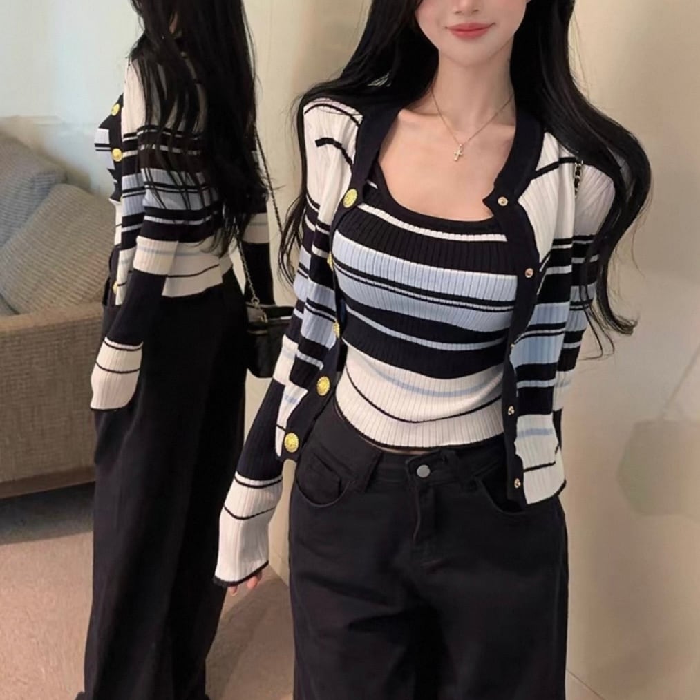 SNS映え☆洗練された印象を与えるボーダー配色アンサンブル♡ランダムなストライプデザインが特徴的なキャミとカーデのセットアップで清楚系でありながらもトレンド感抜群!大人きれいめなお姉さんスタイルが叶います。
