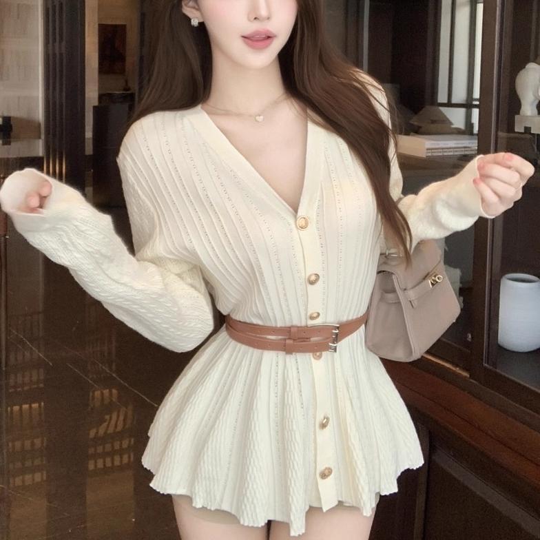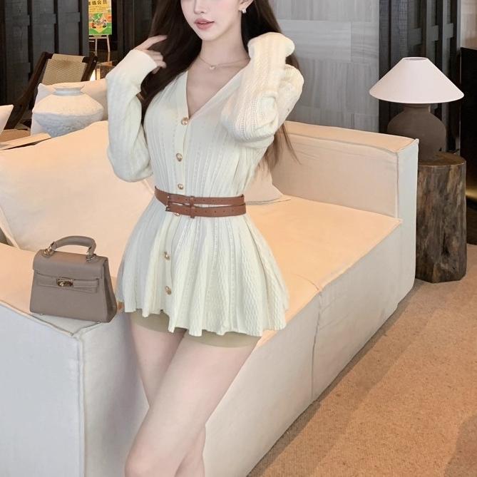シンプルながら華のあるベルト付きVネックペプラムトップスのご案内♡Vネックデザインが首元を美しく引き立て、上品な印象を与えます。リブニット素材で柔らかく着心地が良く、ペプラムデザインがフェミニンなシルエットを生み出します♪韓国カジュアルを意識したスタイルで、普段使いから特別なシーンまで幅広く活躍する一品です!嬉しいベルト付き
