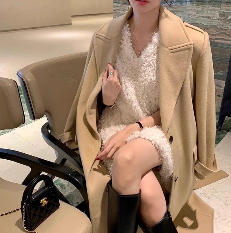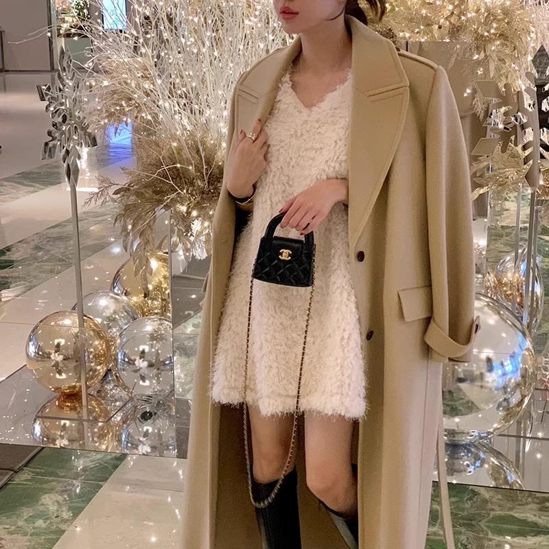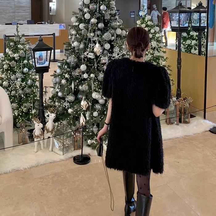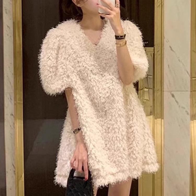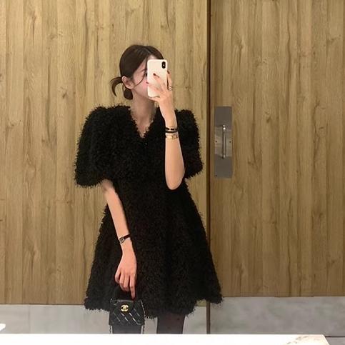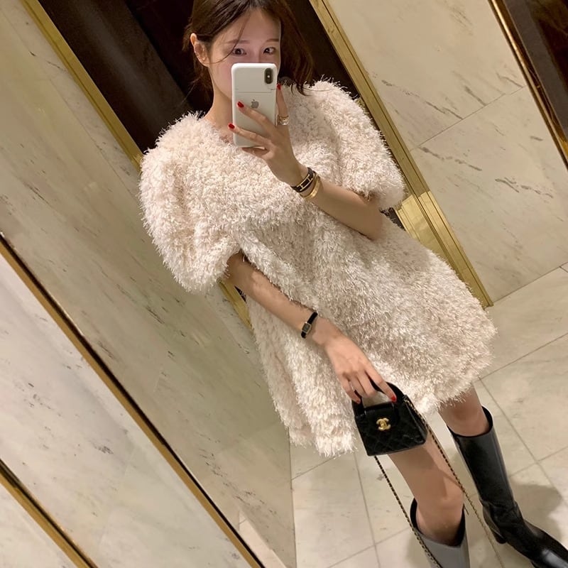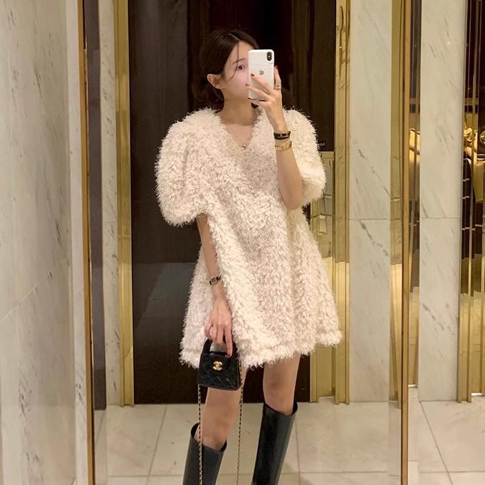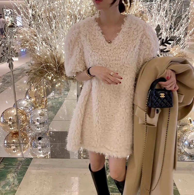 ふわもこ素材が可愛いいふわもこVネックボアワンピ のご案内♡柔らかなボア素材を使用した半袖のミニドレスで、Vネックデザインが華やかさを引き立てます!ゆったりとしたハーフスリーブとミニスカートの絶妙なバランスが、カジュアルからちょっとしたお出かけまで幅広く活用できます♪ロングブーツとの相性抜群!!