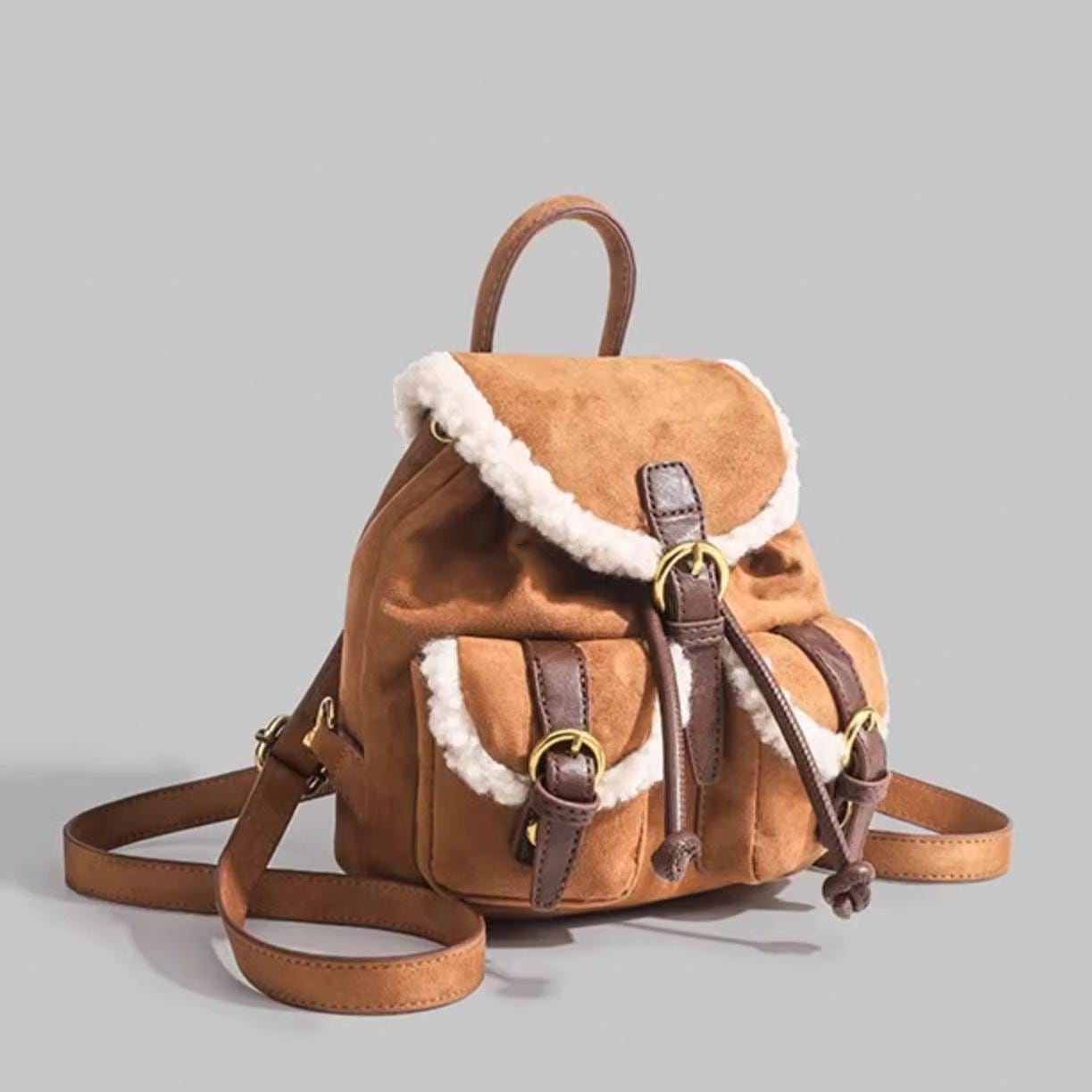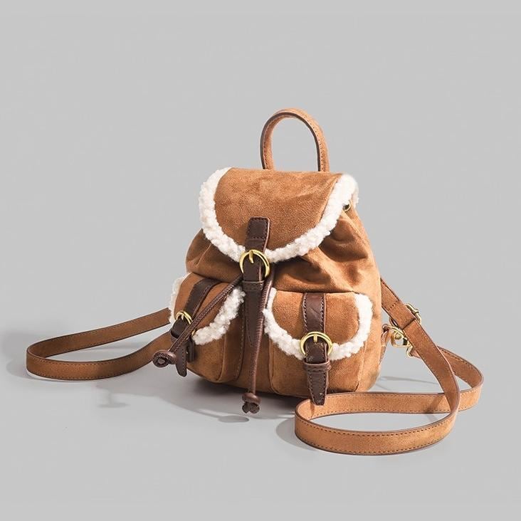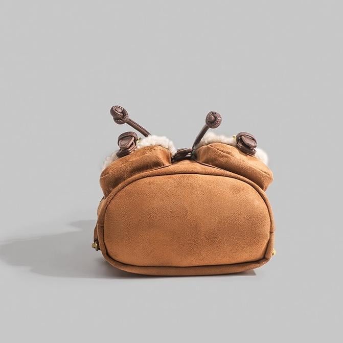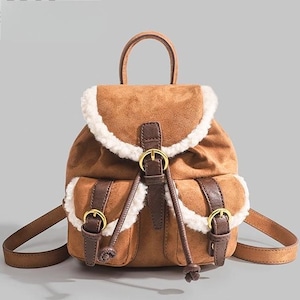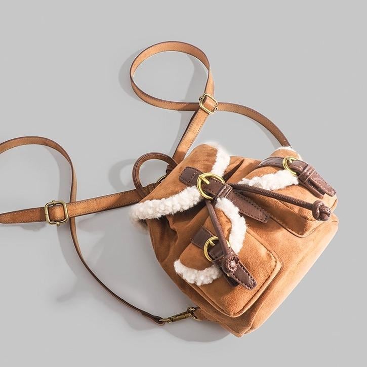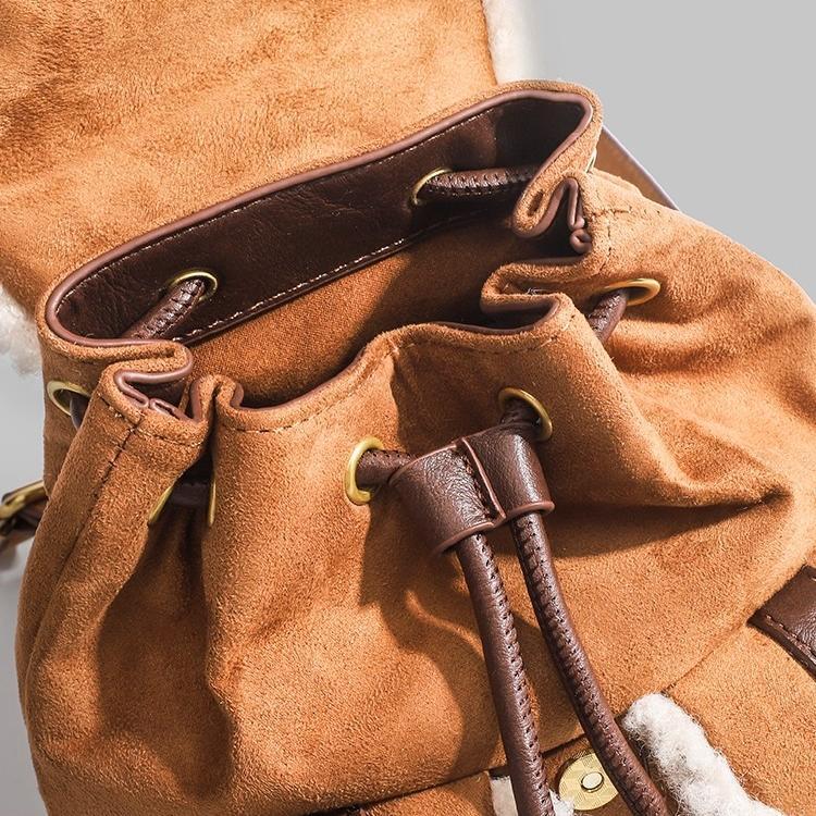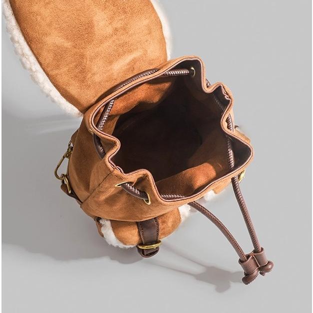 トレンドのムートンシリーズ!おしゃれで個性的な「もこもこボア×スエード風 リュック♡このふわふわのボアとスエード素材を使用したリュックはトレンド感満載で今も時期にぴったり!カジュアルでありながらも洗練された印象を演出します。ドローストリングのデザインが可愛いくデートや普段使いや旅行に大活躍間違いなしです♪