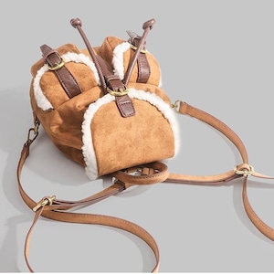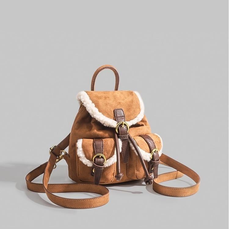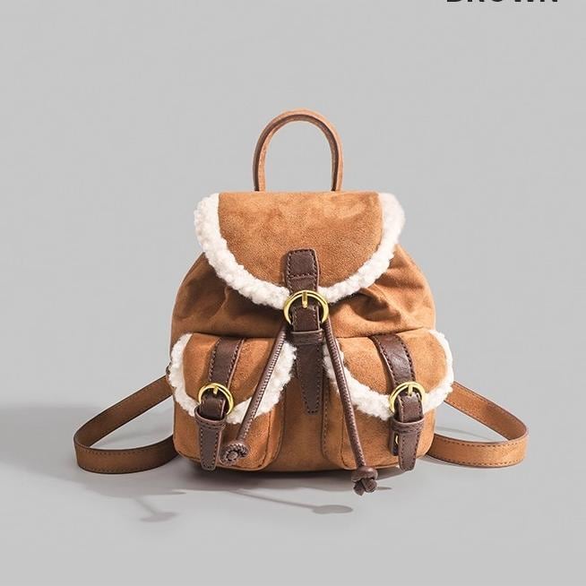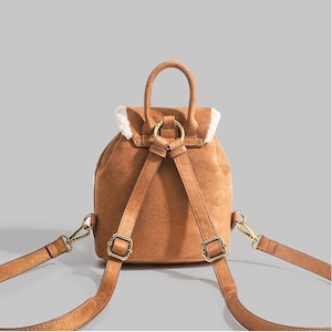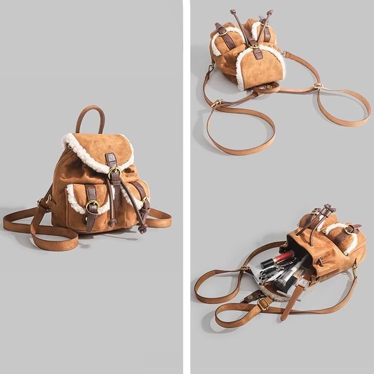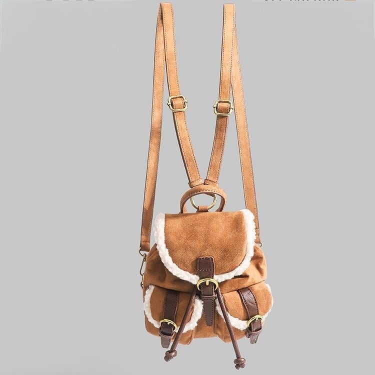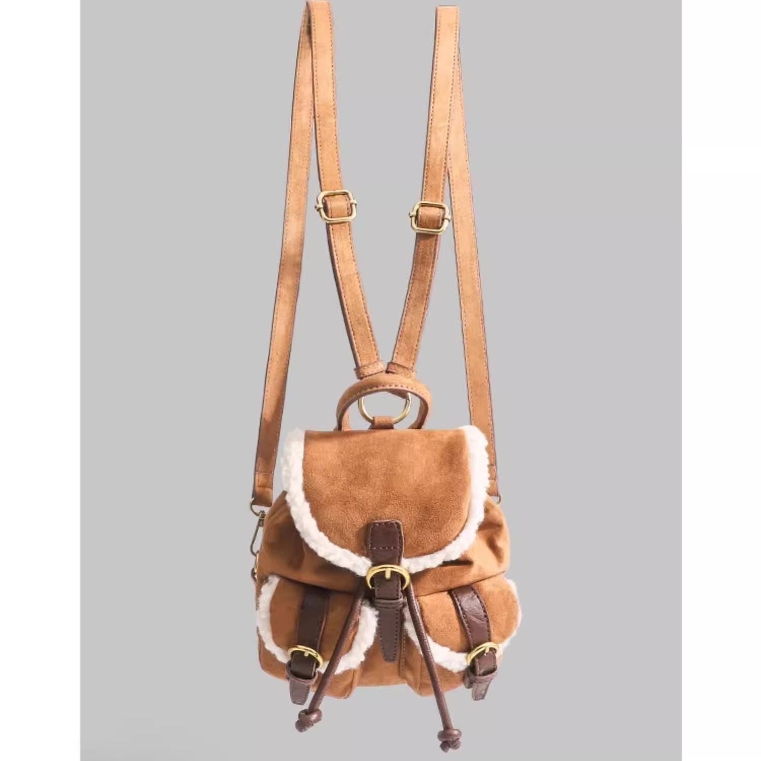 トレンドのムートンシリーズ!おしゃれで個性的な「もこもこボア×スエード風 リュック♡このふわふわのボアとスエード素材を使用したリュックはトレンド感満載で今も時期にぴったり!カジュアルでありながらも洗練された印象を演出します。ドローストリングのデザインが可愛いくデートや普段使いや旅行に大活躍間違いなしです♪