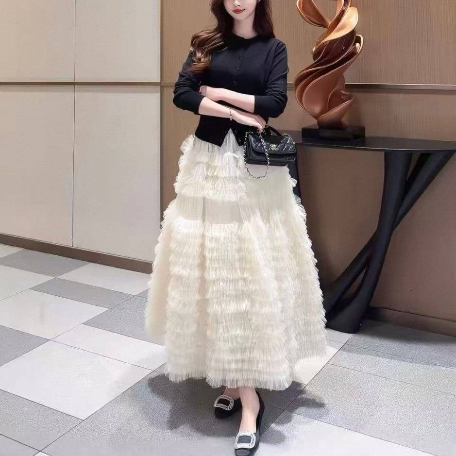 華やかさとボリューム感を兼ね備えたロングスカート♡柔らかなチュール素材が、女性らしい魅力を引き立て、さまざまなトップスとの相性も抜群!!これ一つでトレンド感と大人のこなれ感を出せるおすすめアイテム♡