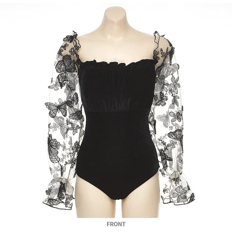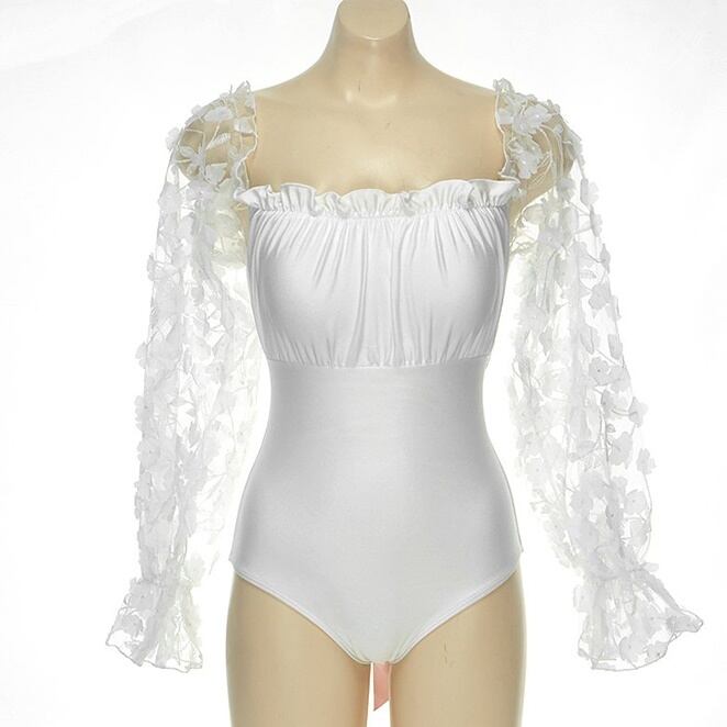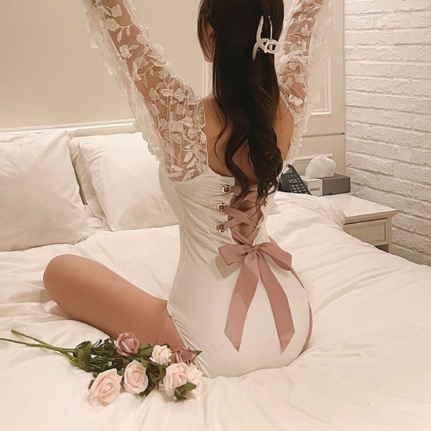 袖のレースとバックの編み上げリボンがポイントのフェミニンなSWIMWEAR♡