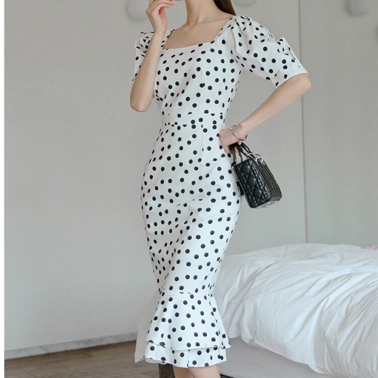 スクエアネックドットマーメイドワンピース