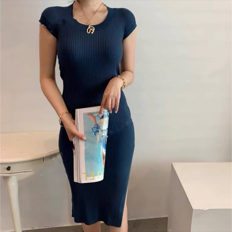 ラウンドネック半袖ニットワンピース