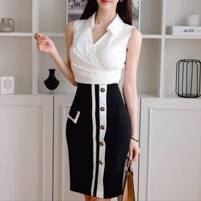 Ⅴネックノースリーブシャツ&ボタン付きバイカラータイトスカート