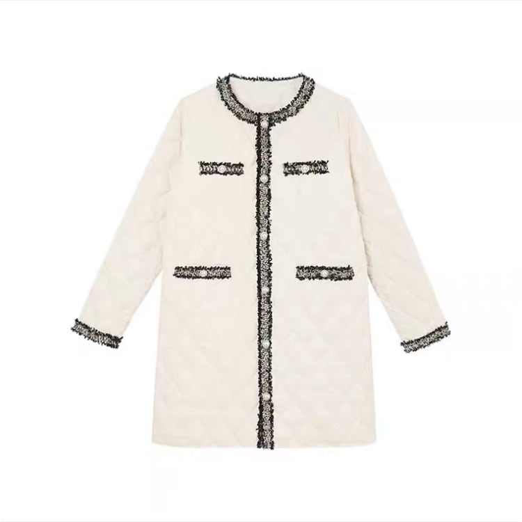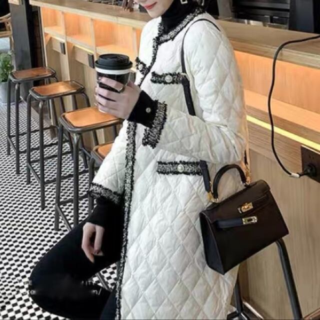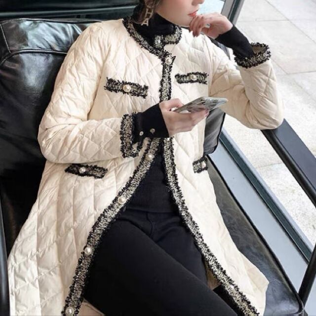 ツィードのラインにパールボタンがアクセントのキルティングコート♡