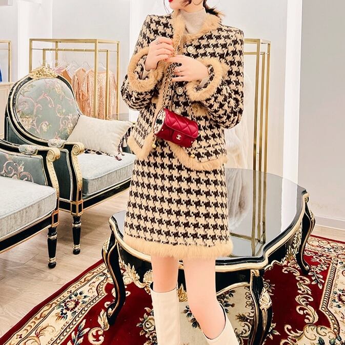 ファー付き千鳥格子セットアップ