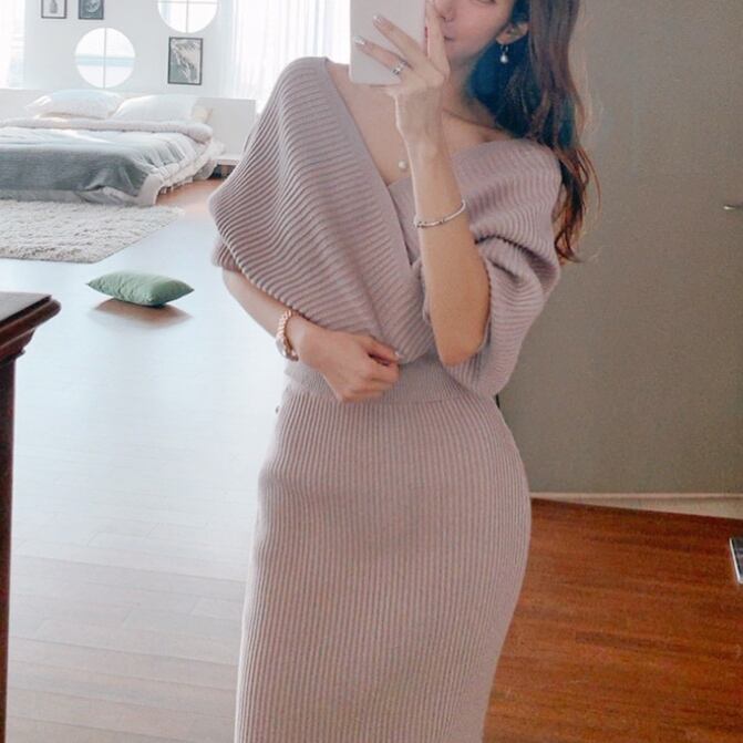 ルーズ感がセクシーなVネックニットとニットスカートのセット♡