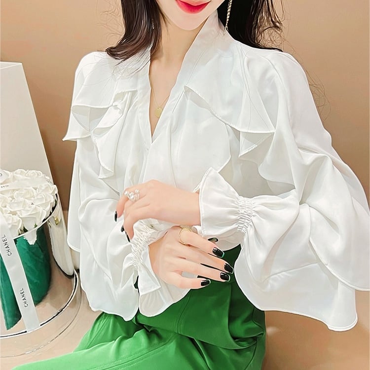 Vネックフリルフレアスリーブシャツ
