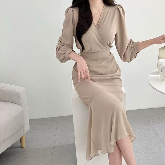 シンプルなデザインの中にスカートラインがシースルーになっているのがポイントの上品なワンピース❤