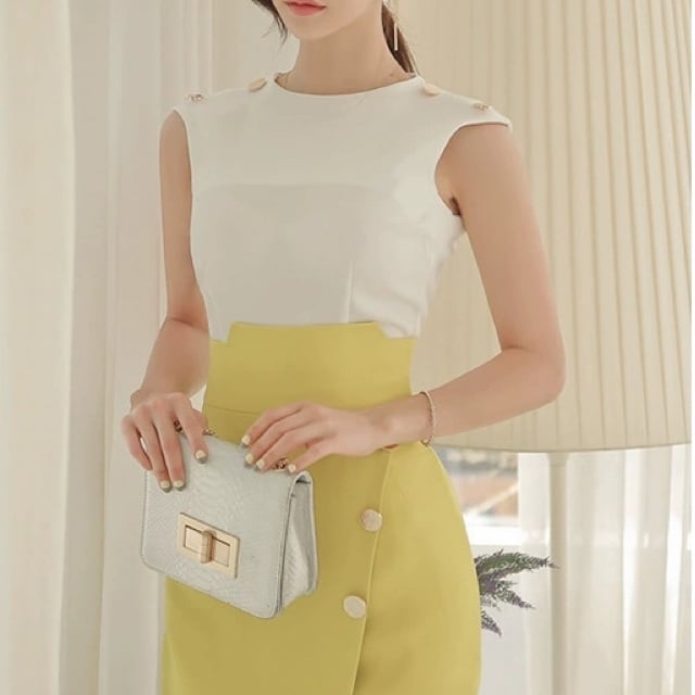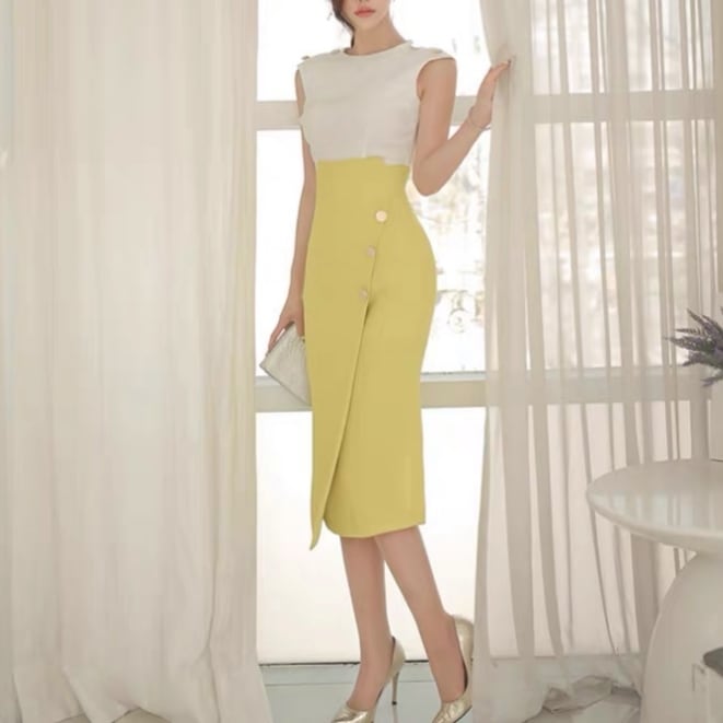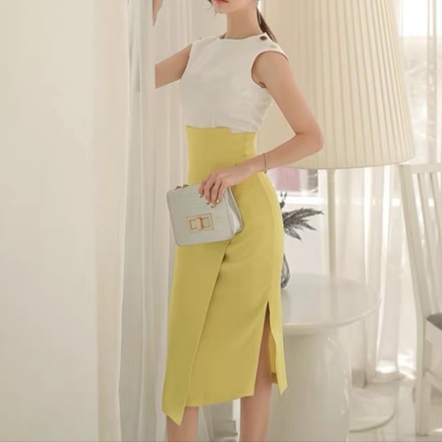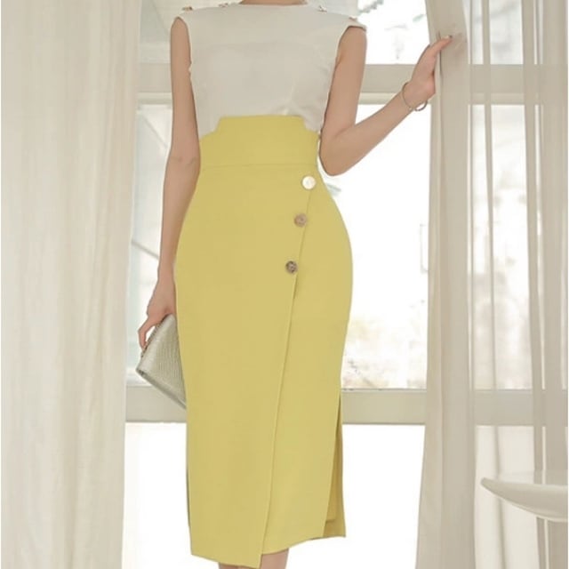 トレンドのイエローカラーが目を惹くペンシルスカートはハイウェストなのでスタイルアップが狙えます♡