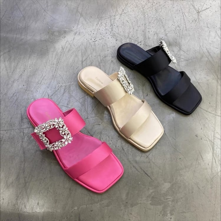 スクエアビジューフラットサンダル