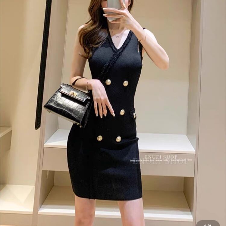 ゴールドボタンVネックタイトワンピース〈NEW〉