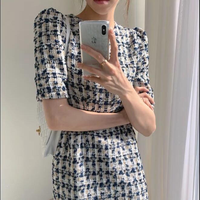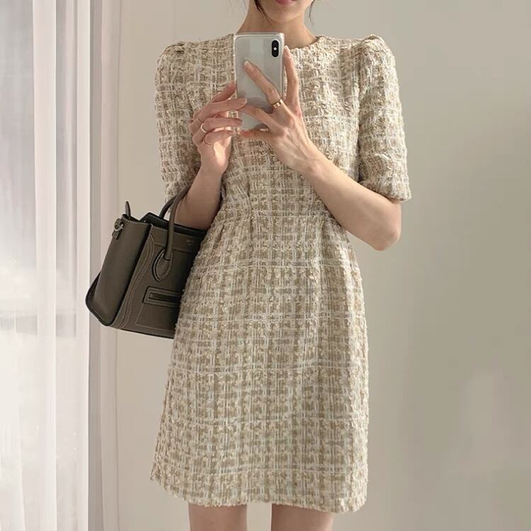 パフスリーブにウエストがくびれたシルエットが可愛らしさ満載のツィードミニワンピース♡