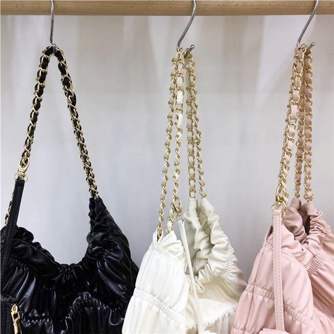 洗練されたデザインと機能性を兼ね備えたポーチ付きギャザーチェーンバック♡上品なギャザーデザインとシックなカラーリングが、どんなスタイルにもマッチします。