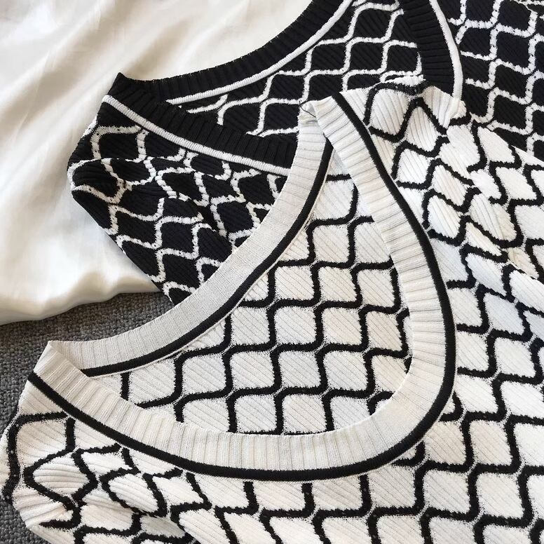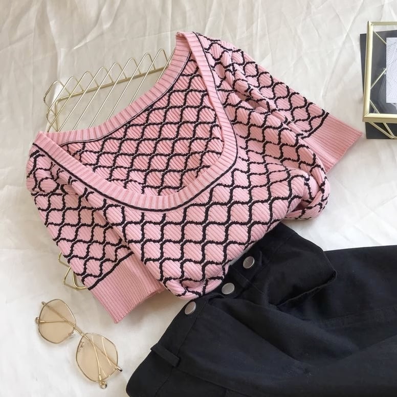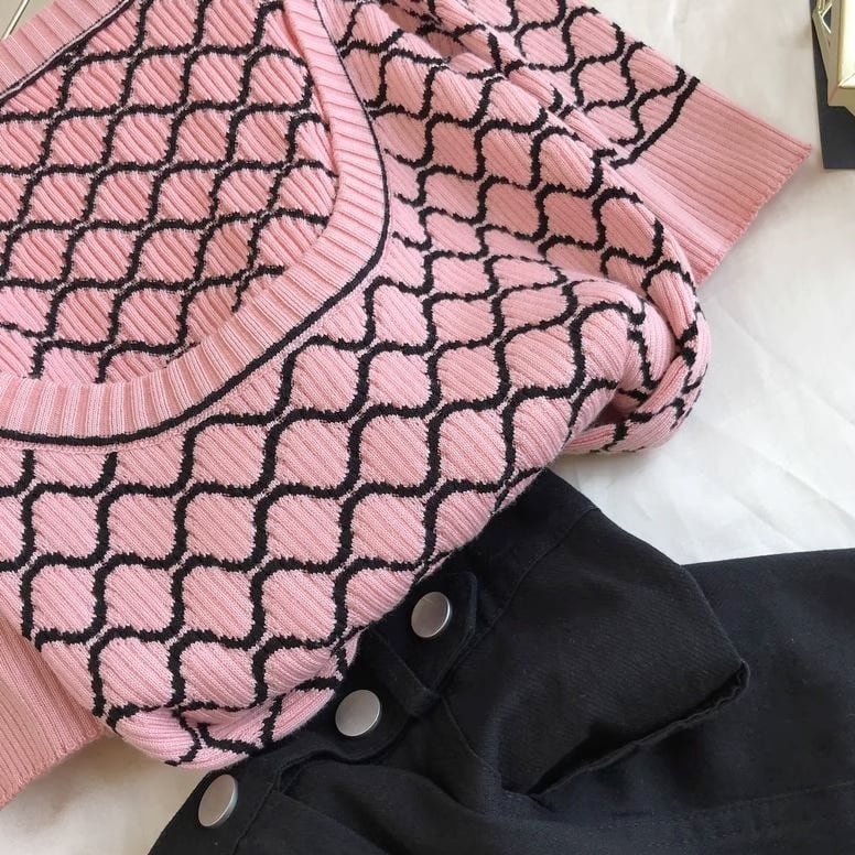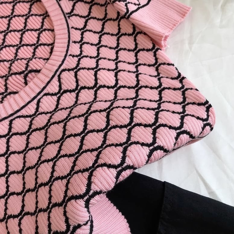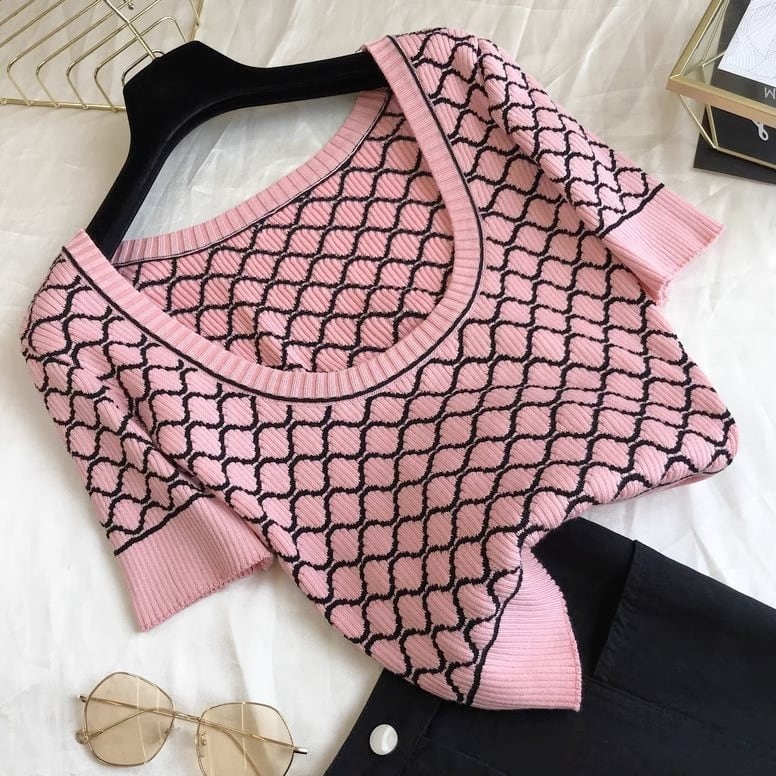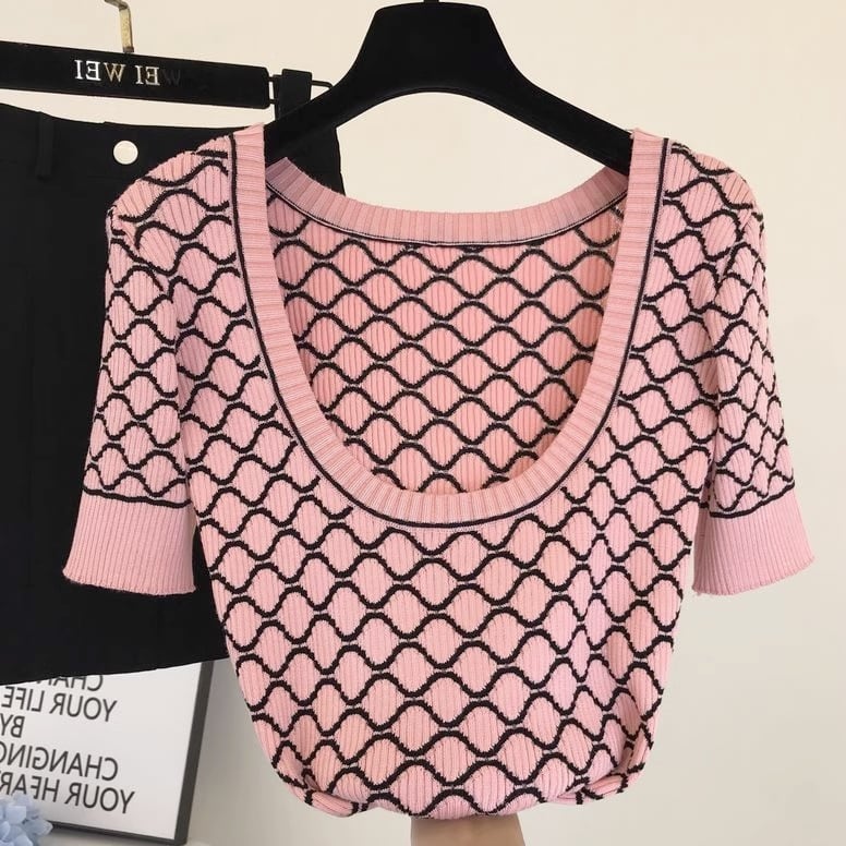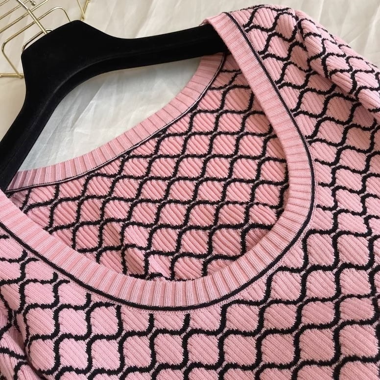 上品で優雅なデザインのダイヤ柄五分袖Uネックニットです!柄のデザインは、シンプルでありながらもワンポイントのアクセントになっています♡五分袖デザインなので、春から秋までの季節にぴったりです♡Uネックなので、首元がすっきりと見え、女性らしいシルエットを演出することができます。