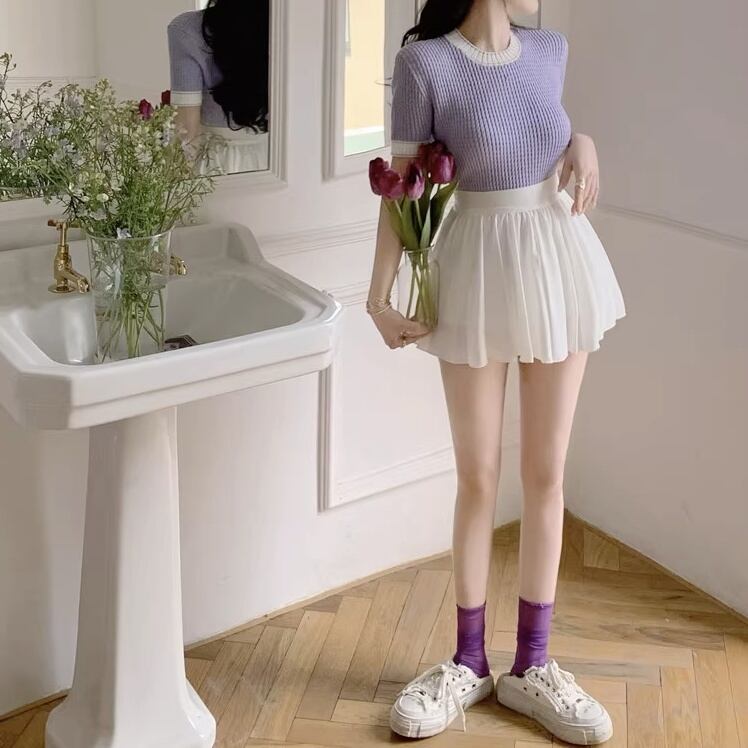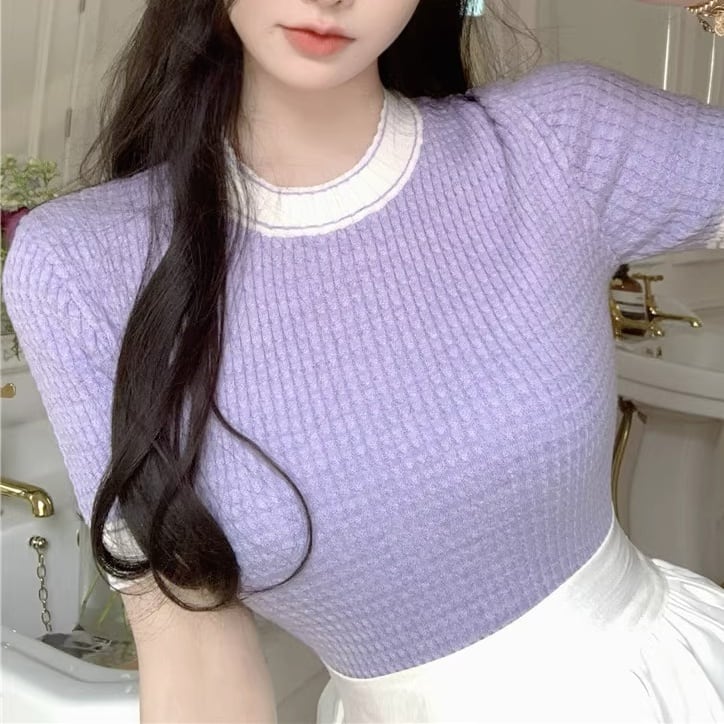 鮮やかなパープルが可愛い♡ベーシックなデザインなので、どんなボトムスとも相性ばっちりで、おしゃれな着こなしを叶えます。