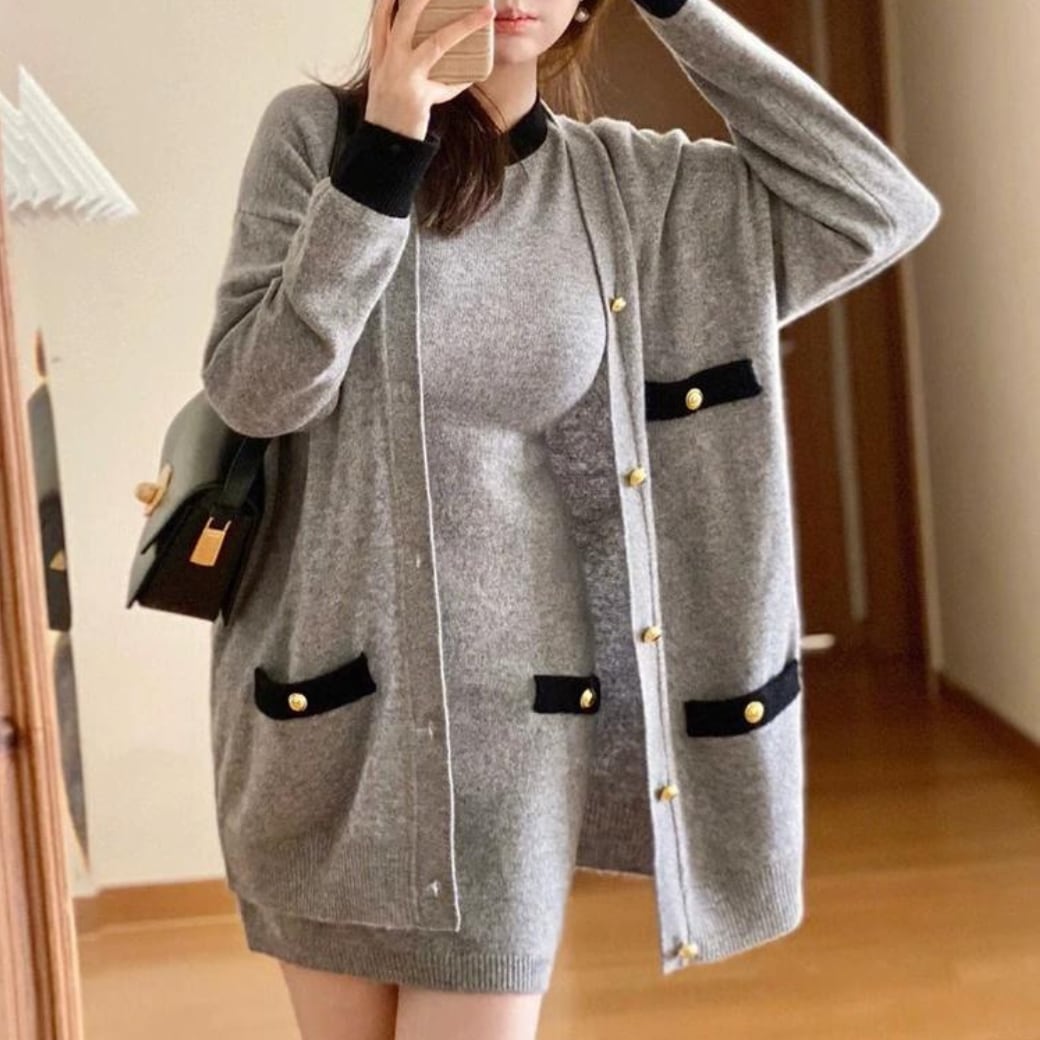 バイカラーロングカーデ&ワンピースセット