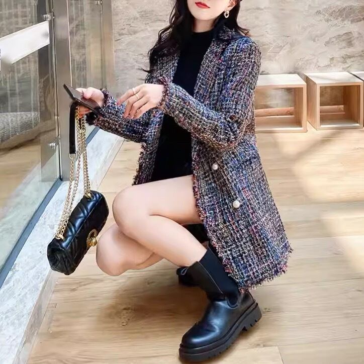鮮やかな色合いと豪華なデザインが特徴のミックスツイードロングジャケット。