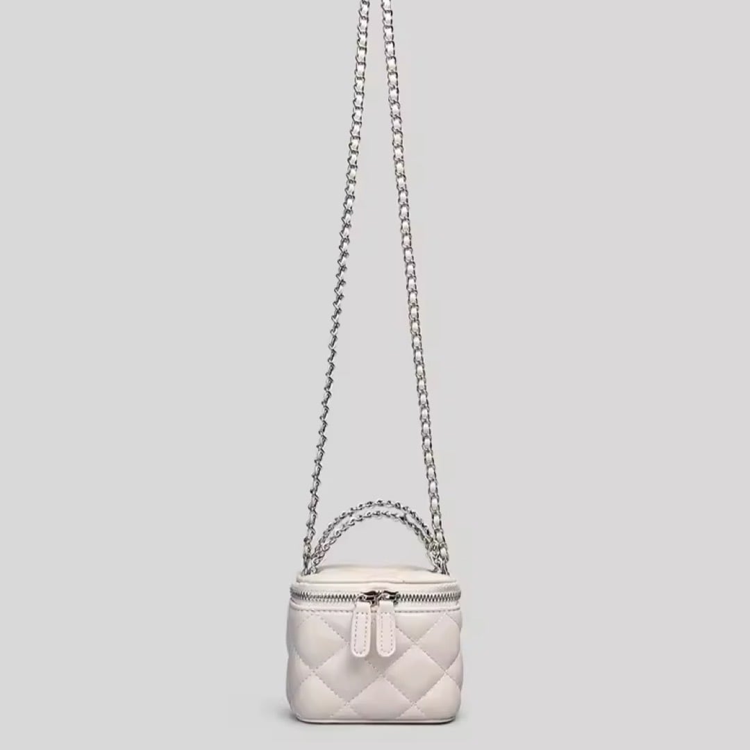 キルティングデザインがエレガントな印象を与え、チェーンストラップが上品さを演出します。