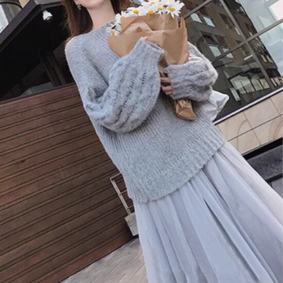 カジュアルながらもおしゃれなルーズセーター&メッシュスカートセットアップ。