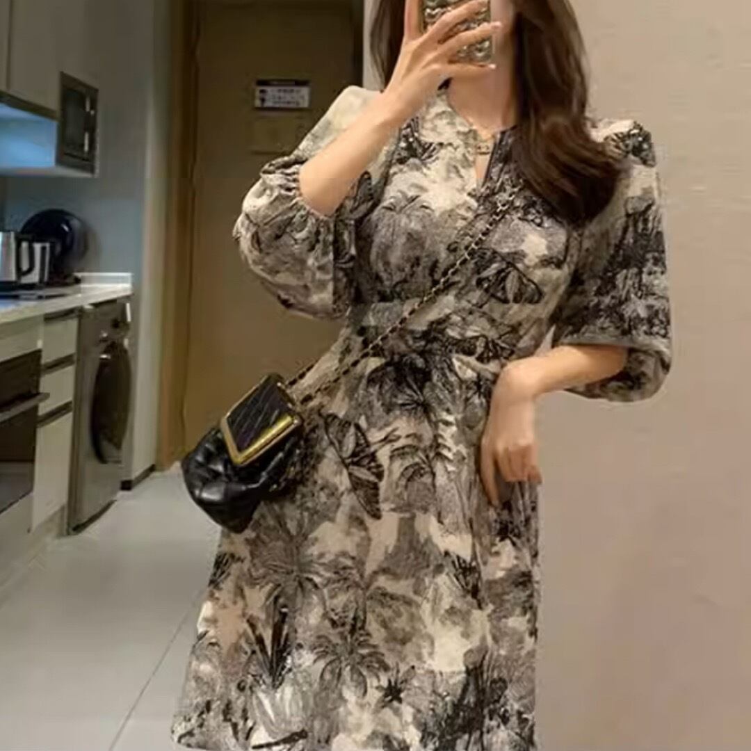 華やかで可愛らしい花柄七分袖フリルミニワンピース。