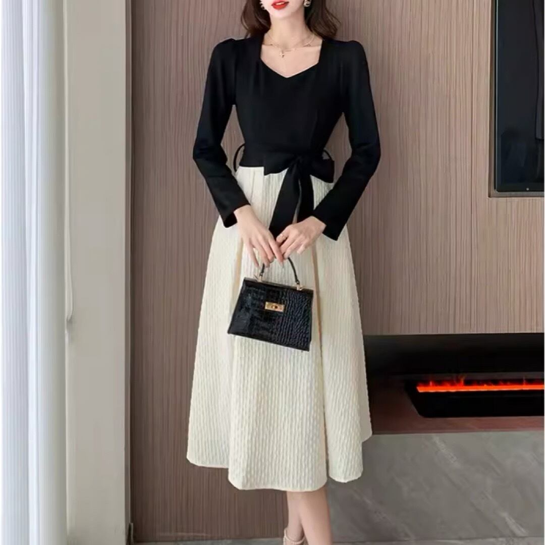 ウエストリボンが女性らしいシルエットを演出し、体型に合わせて調節可能です。