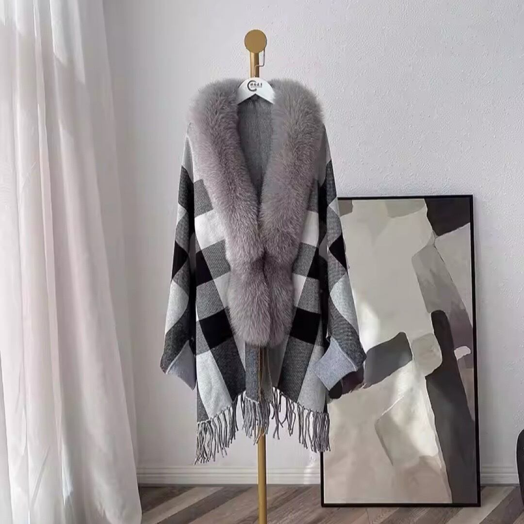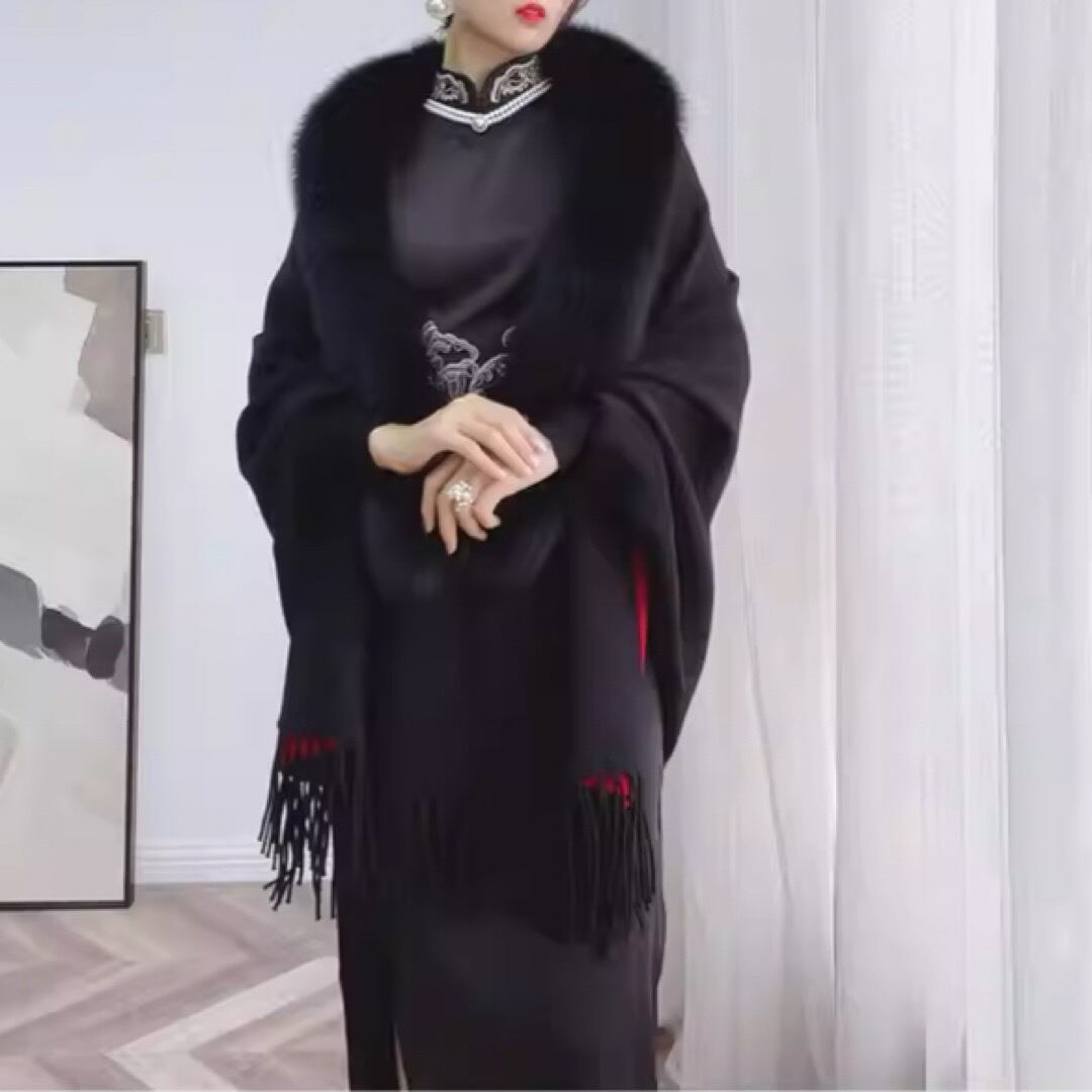 ファー付きフリンジマントショール