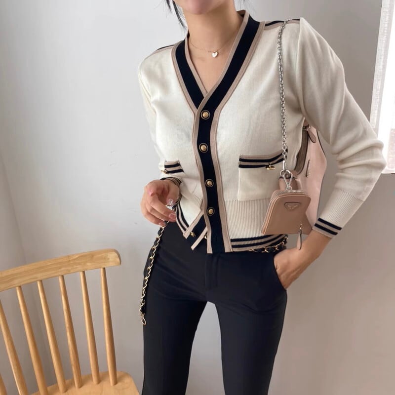 コントラストカラーがおしゃれなVネックスリムカーディガン。