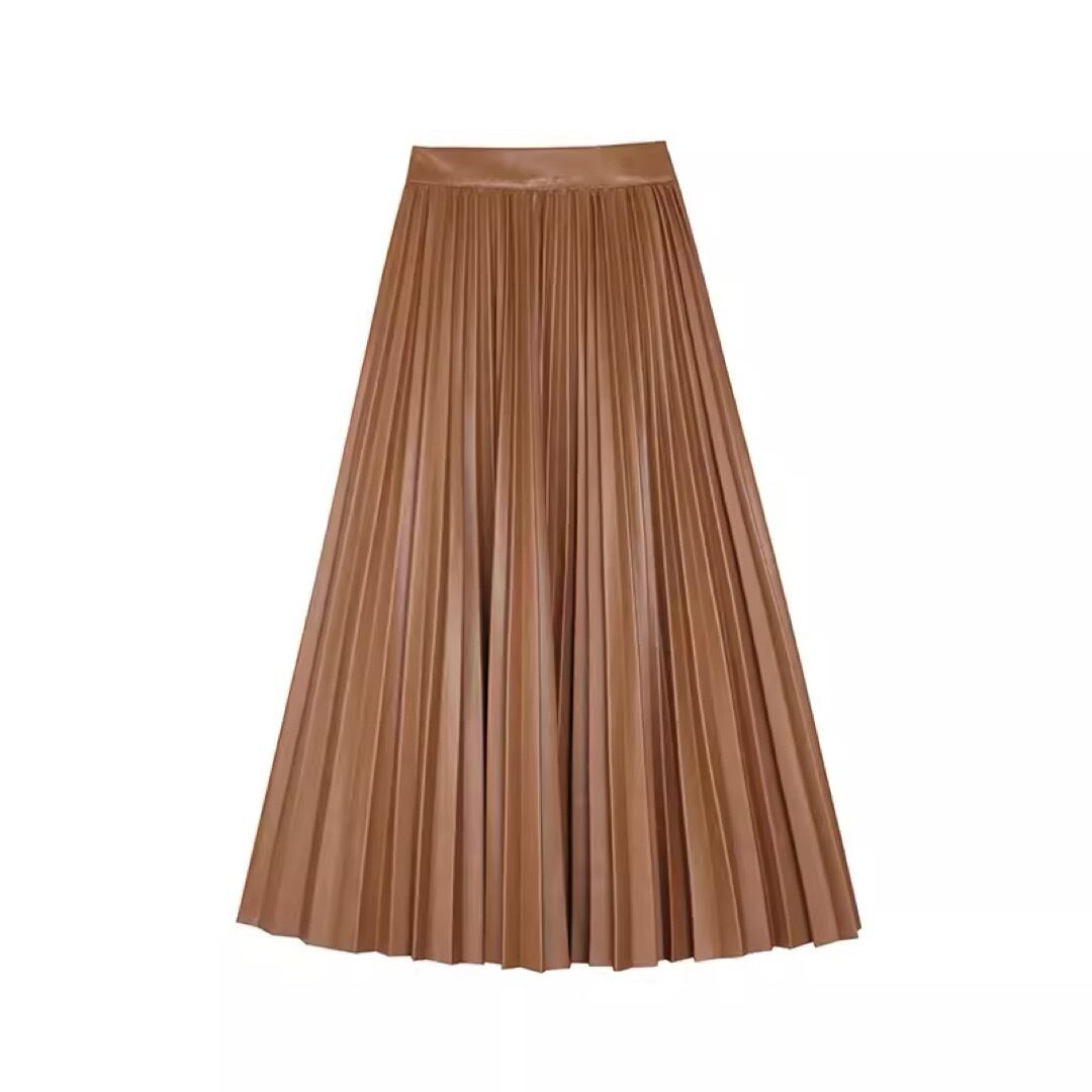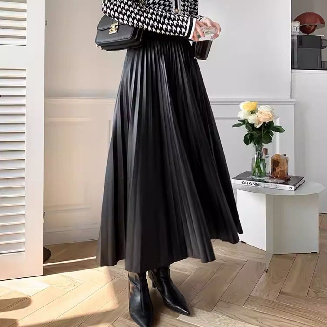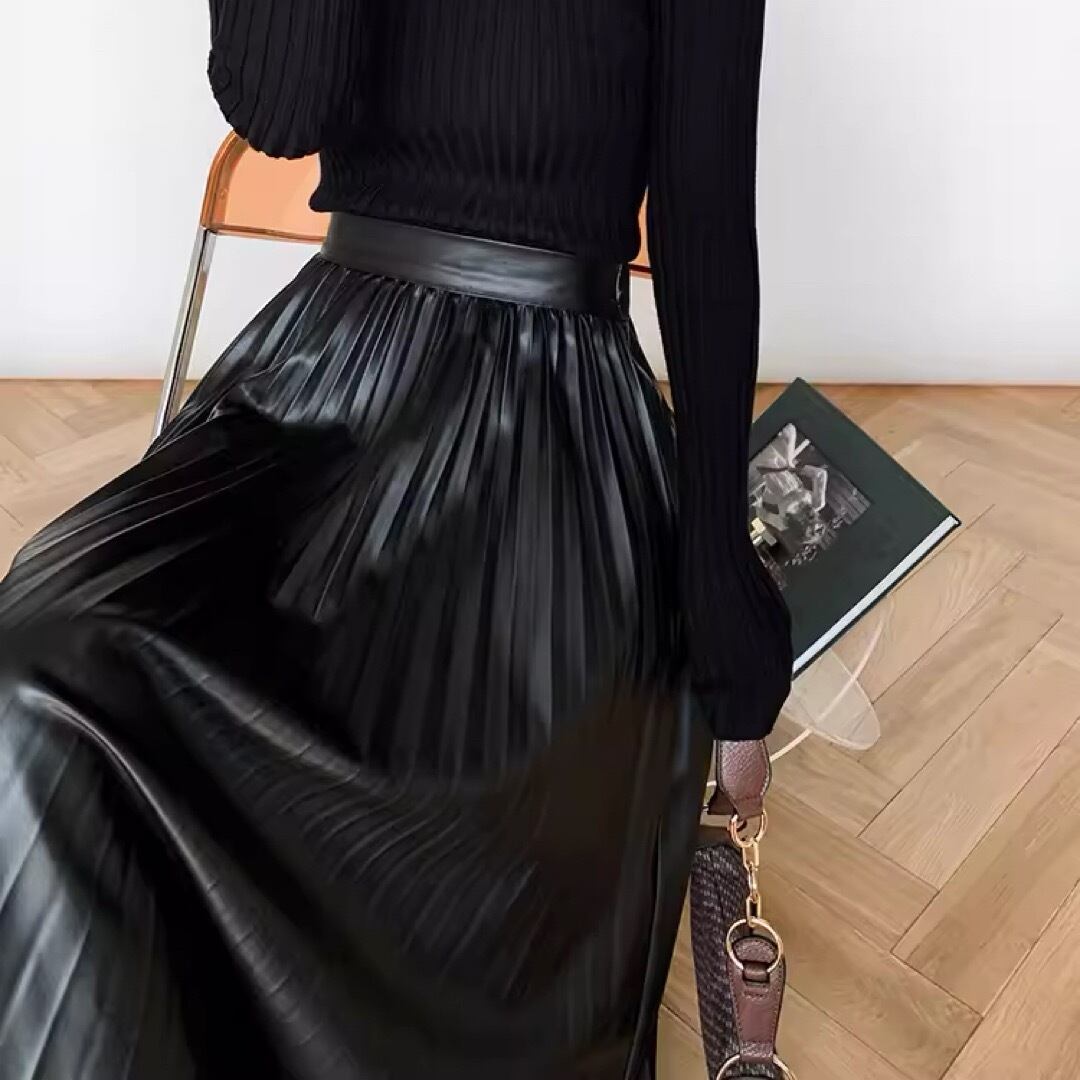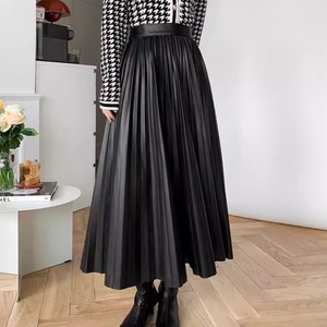 フェイクレザーを着こなしやすくフェミニンシルエットにした、ロングプリーツスカート。
