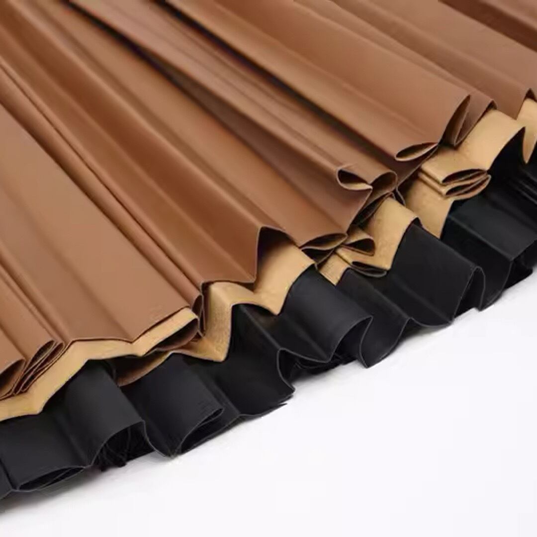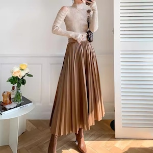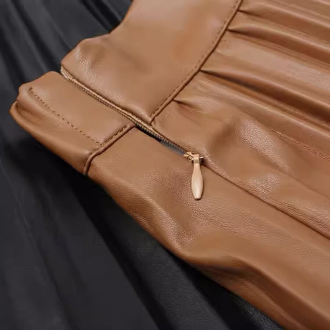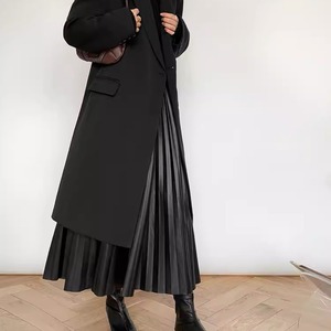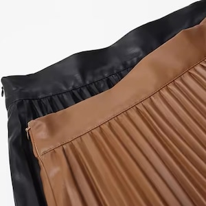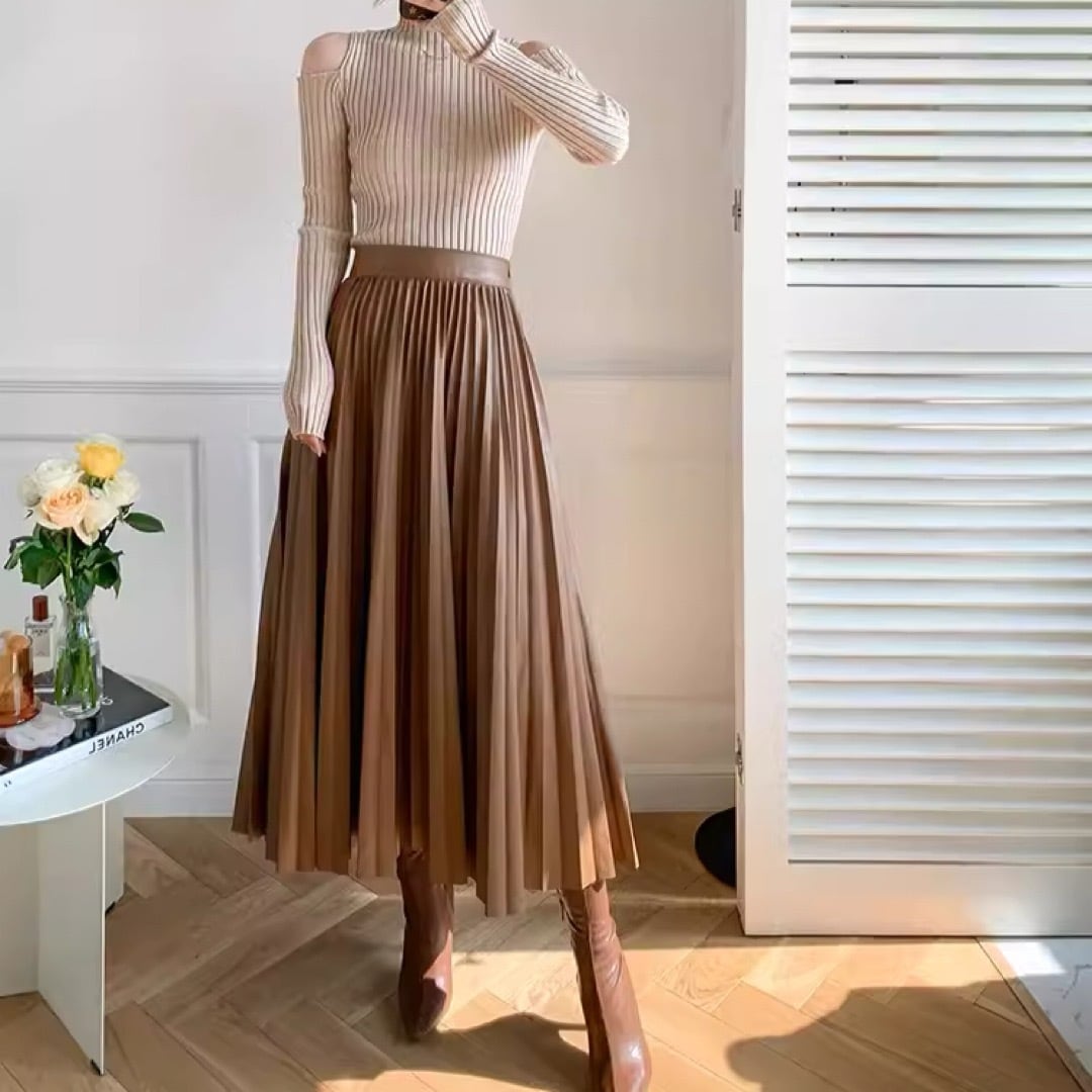 フェイクレザーを着こなしやすくフェミニンシルエットにした、ロングプリーツスカート。