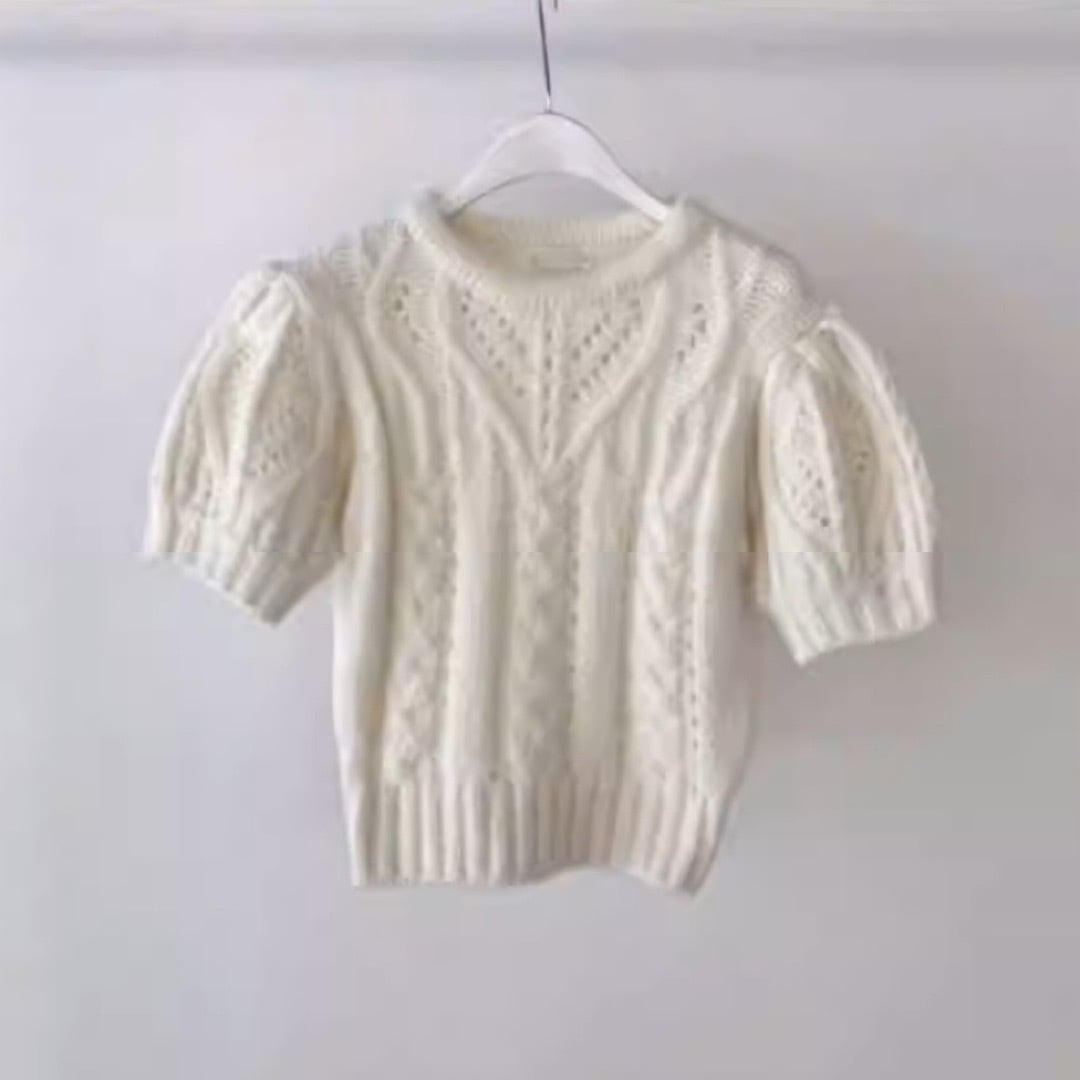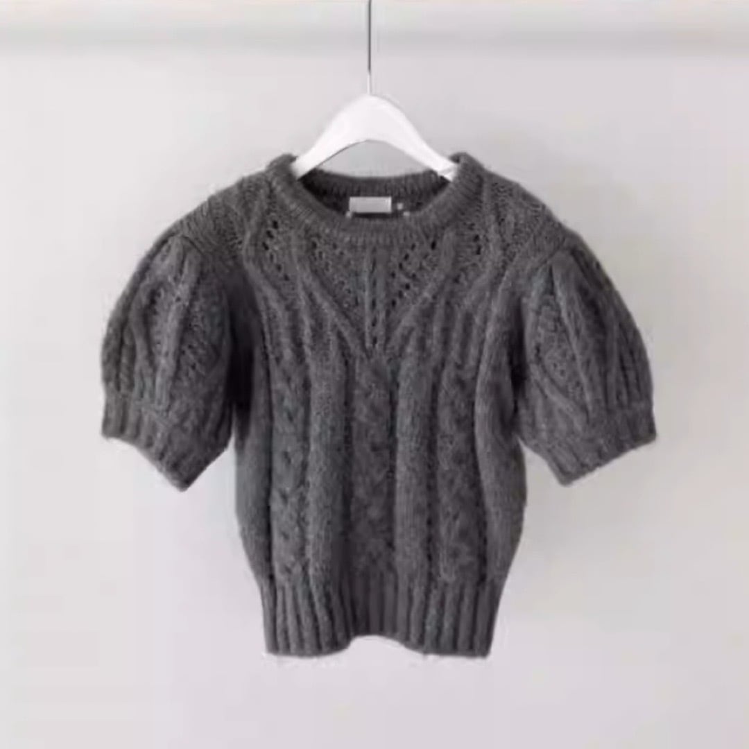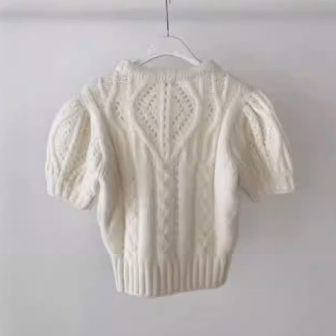 一枚で旬のコーディネートが完成する、パフスリーブ半袖ケーブルニットセーター。