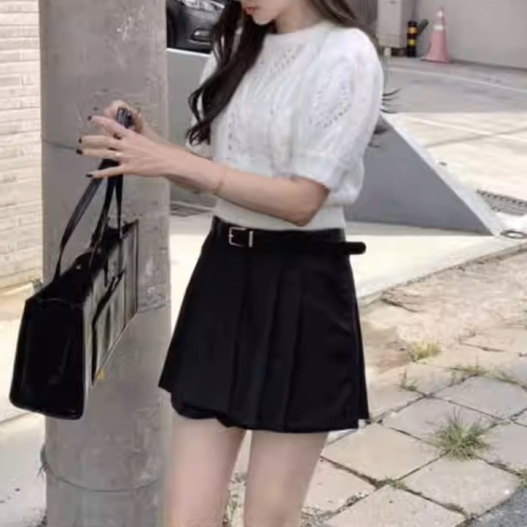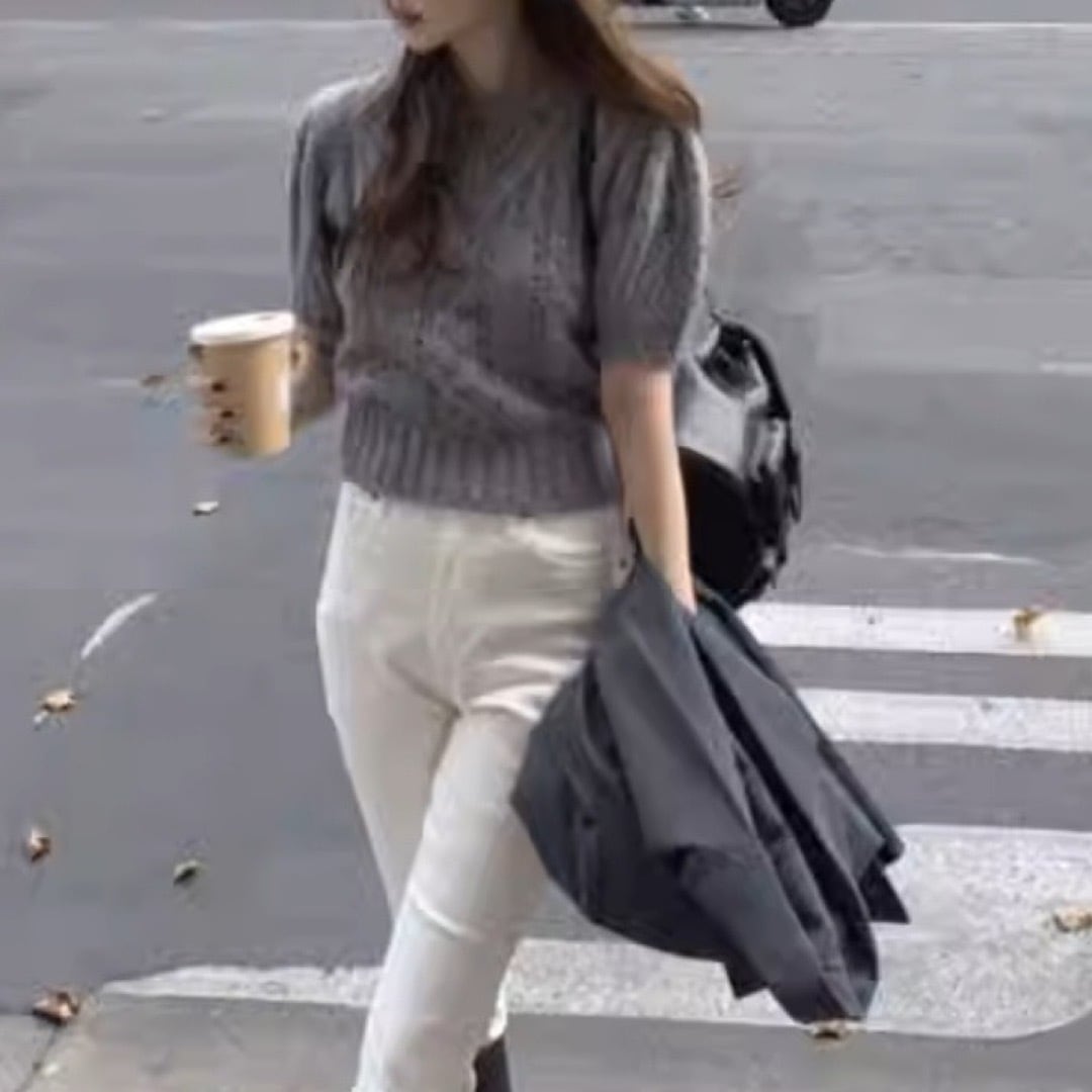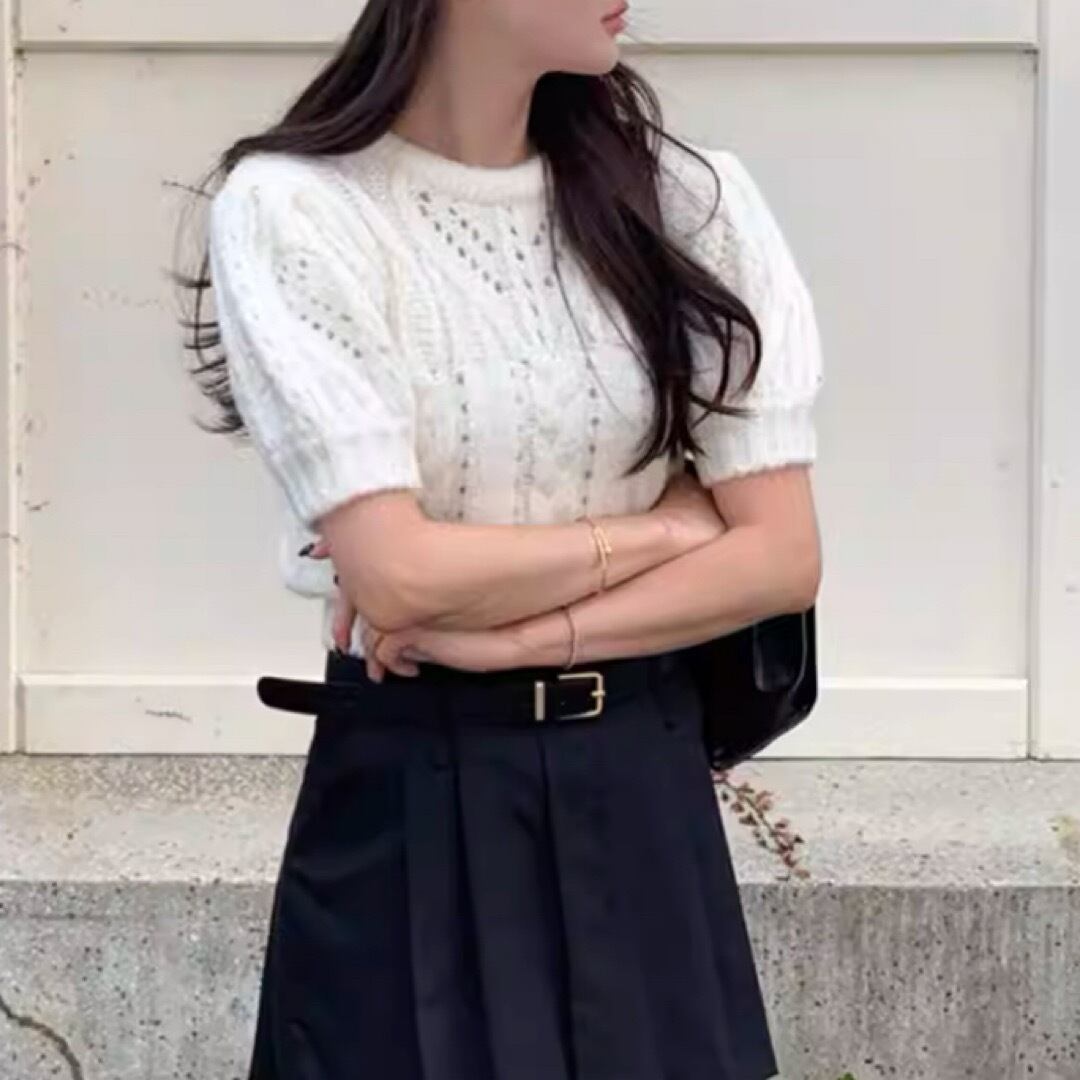 一枚で旬のコーディネートが完成する、パフスリーブ半袖ケーブルニットセーター。