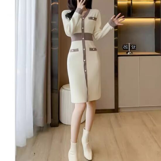 Vネックバイカラーウールニットワンピース〈NEW〉