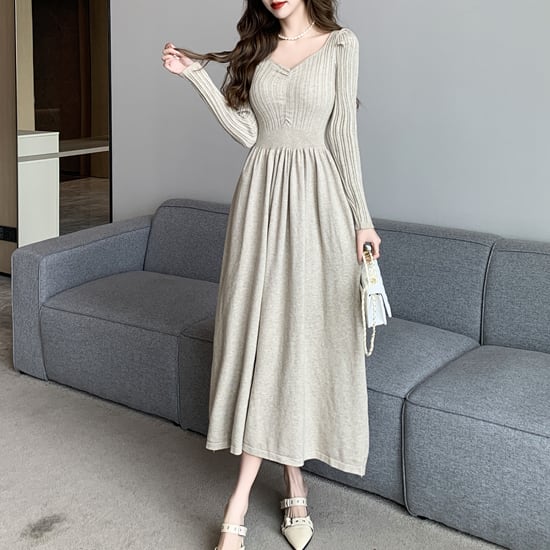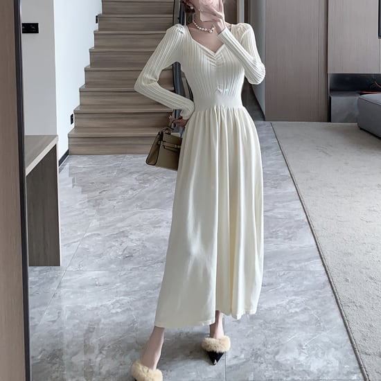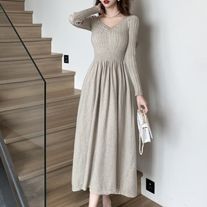 シンプルながらもエレガントな雰囲気が漂うVネックAラインロングニットワンピース。