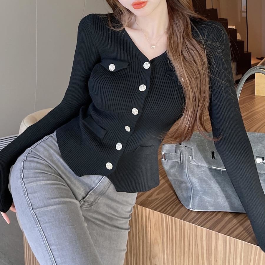 シンプルでありながらも洗練されたデザインが魅力のVネックニットスリムトップ。
