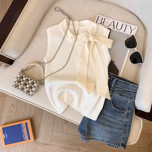 爽やかな印象のボウタイ付きノースリーブトップ。