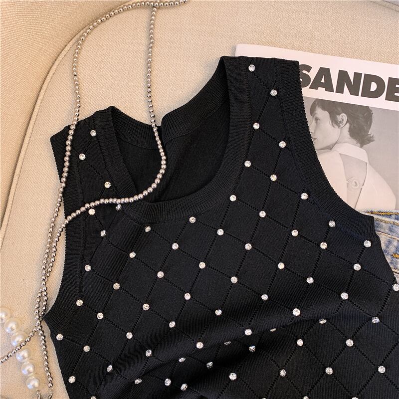 繊細なビジューが施された、華やかなダイヤモンドパターンのニットトップ。