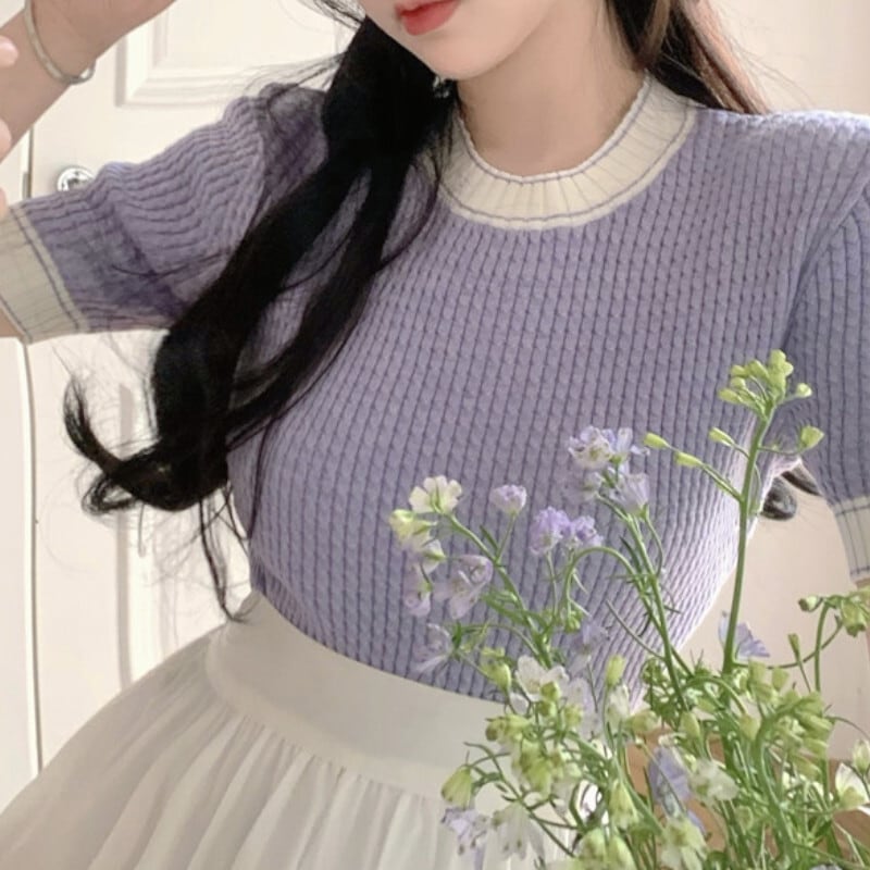 快適な着心地が自慢の、ラウンドネック半袖ニットトップ。