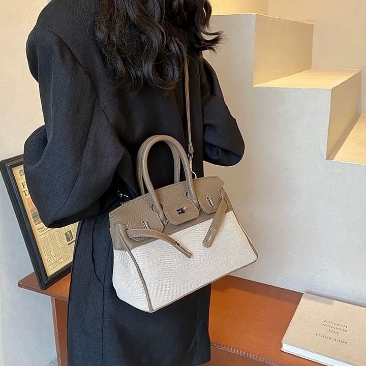 レトロなデザインが魅力的なコントラストハンドバッグ。